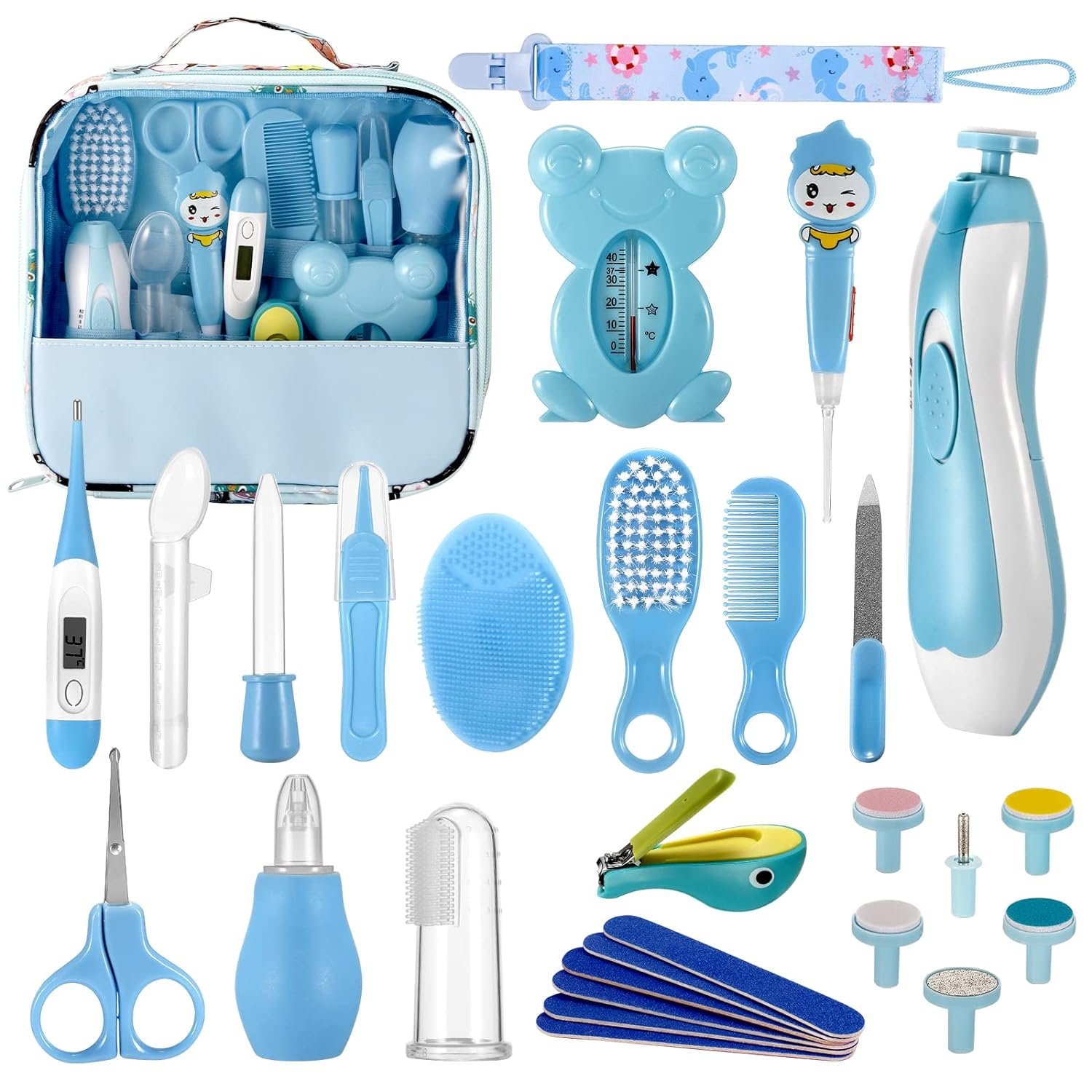 👼[Upgraded Fully Equipped 29-Piece Baby Kit]- Donpow Baby healthcare and grooming kit includes baby digital thermometer, nail clippers, rounded safety scissors, electric nail trimmers, 6 grinding heads, nasal suction, baby brush, baby comb, baby bath brush, pacifier clip for baby, baby feeder dropper, tweezers, finger toothbrush, Earwax spoon LED light and cute portable suitcase, fully meet the baby’s daily needs, suitable for home travel or on the go. The best baby necessities for newborns!