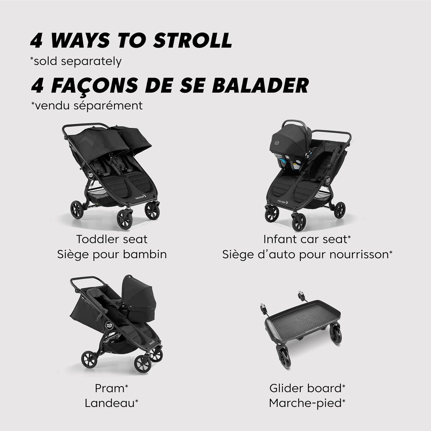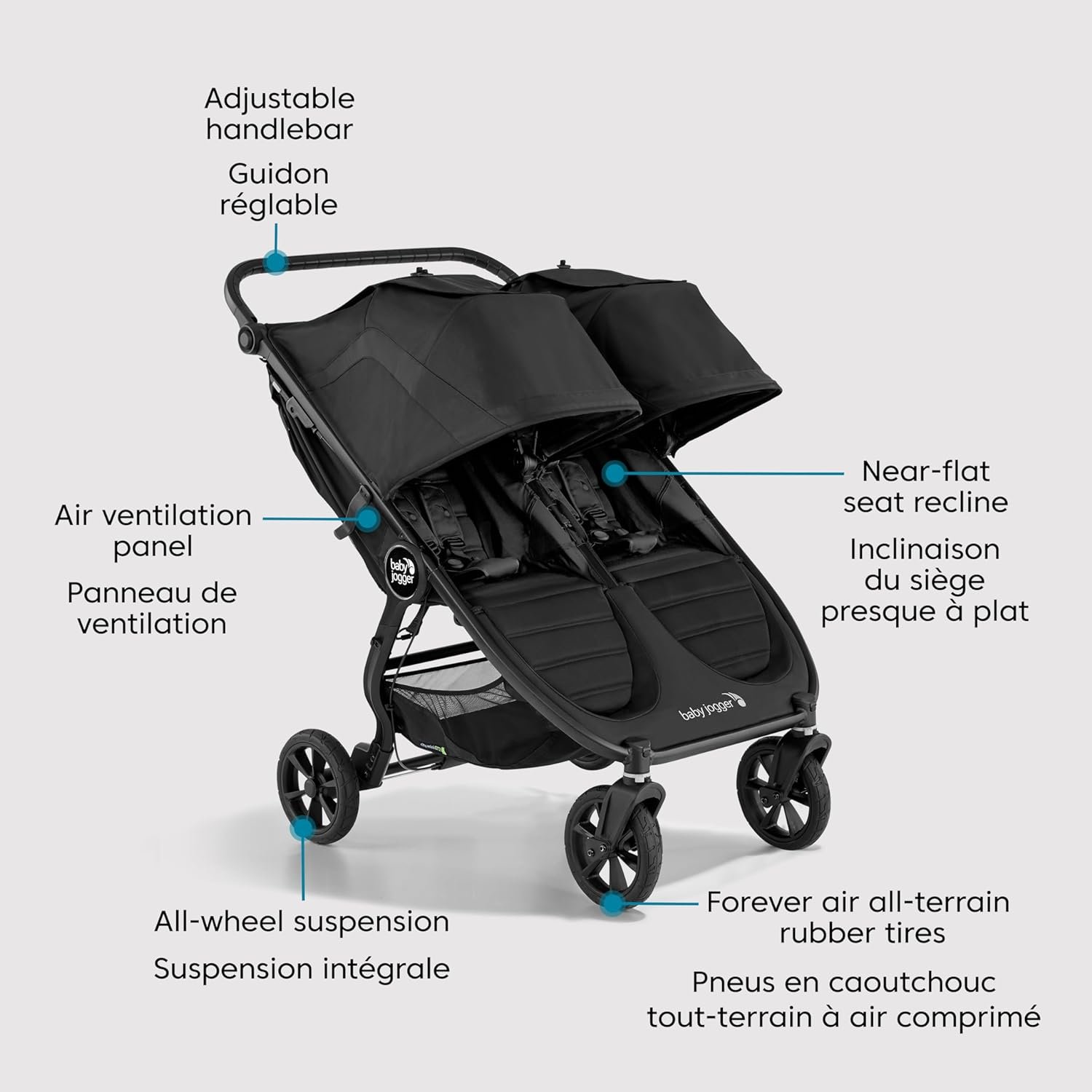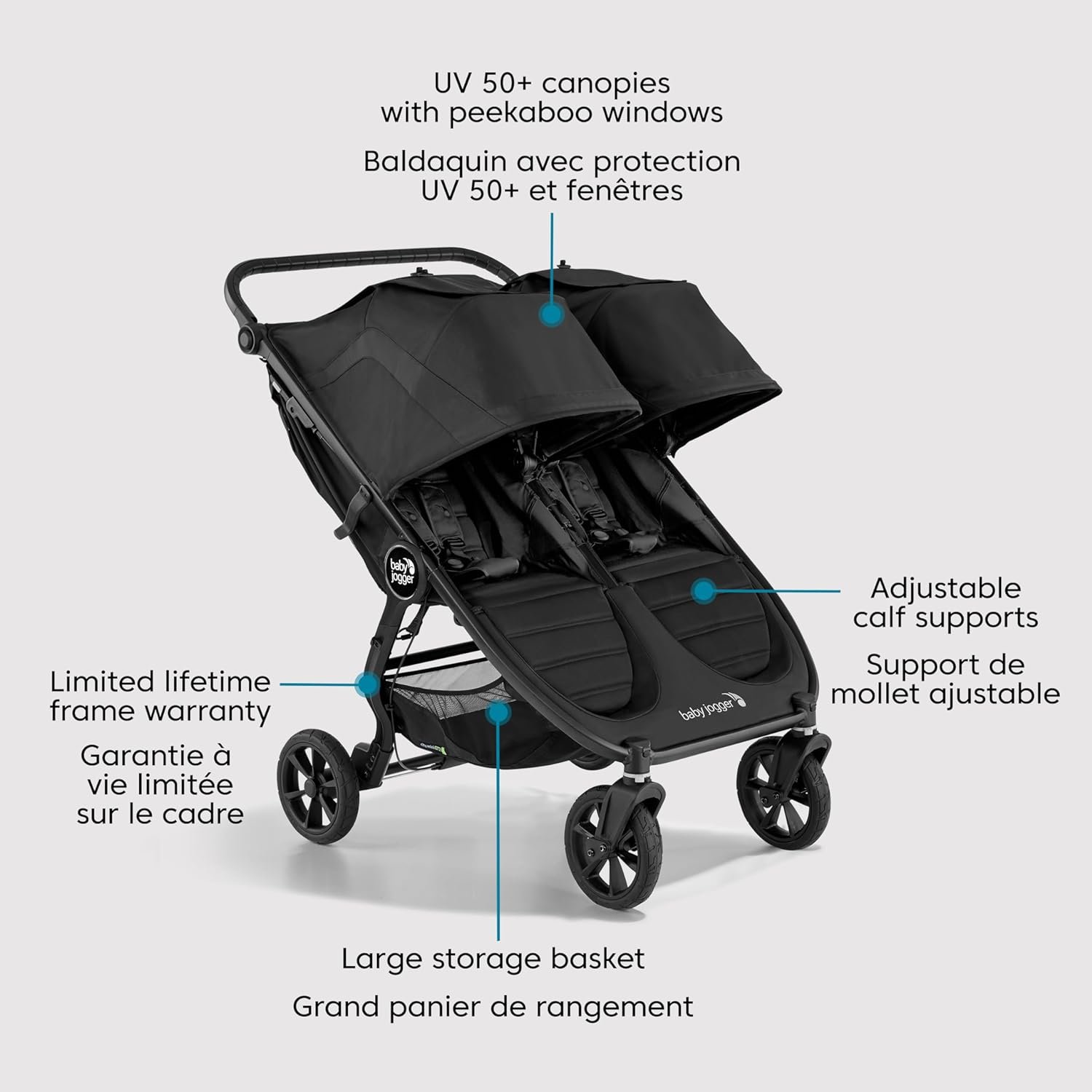 The Baby Jogger City Mini GT2 Double Stroller provides uncompromising agility on any terrain, thanks to forever-air rubber tires that will never go flat and all-wheel suspension. Even with two in tow, this lightweight double stroller won’t slow you down, as it fits through any standard doorway and folds quickly and easily with the signature Baby Jogger one-step, in-seat fold. Adjustable calf supports and near-flat reclining seats help you find the most comfortable position for your children. The adjustable handlebar, hand-operated parking brake, and extra-large storage basket provide ultimate convenience. UV 50 canopies with peekaboo windows keep your children shaded on your adventures together. Create a travel system with a Baby Joggercar seat or City Mini 2 Double Pram, or customize your ride with a variety of accessories.