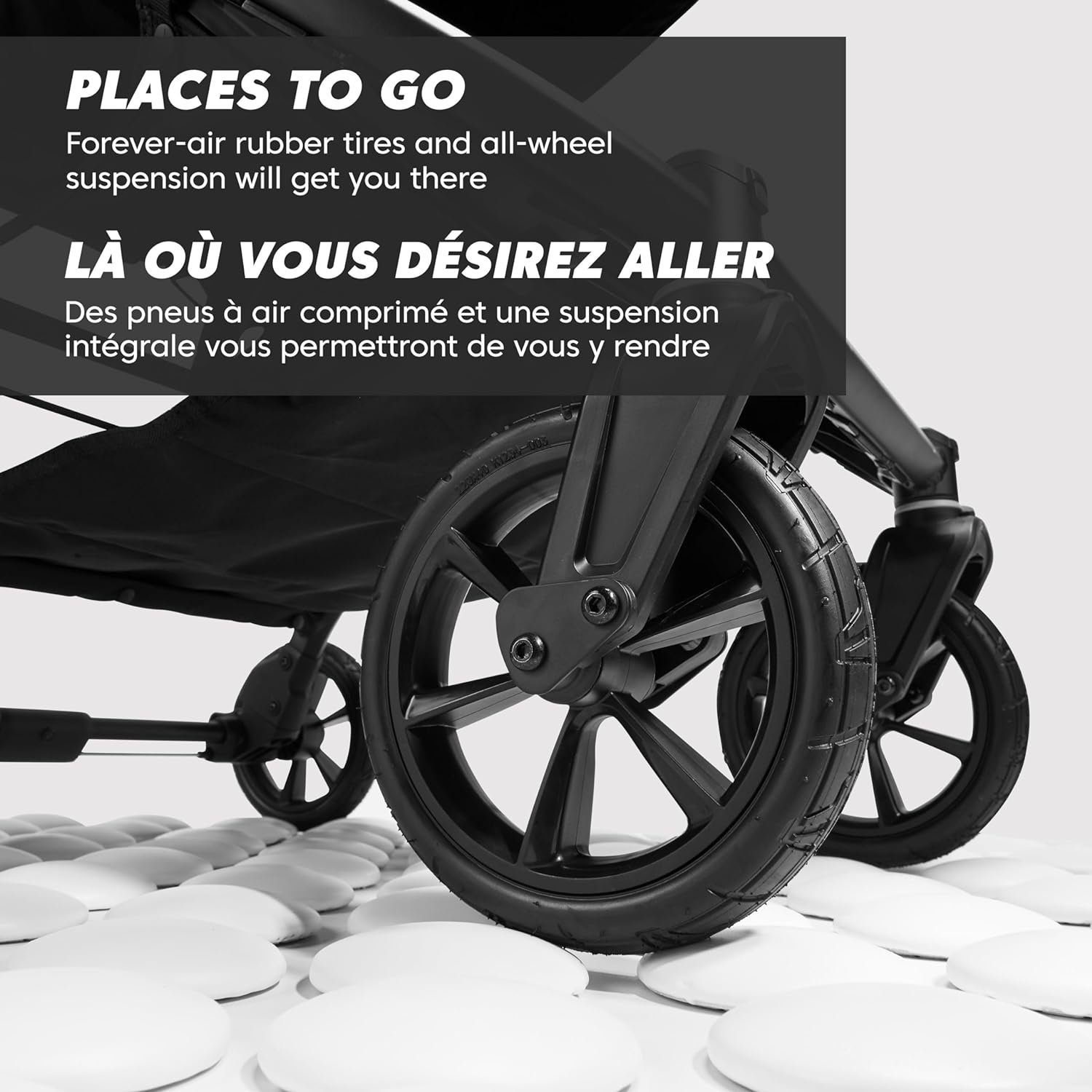 Forever air rubber tires with all-wheel suspension provide a comfortable stroll on any terrain