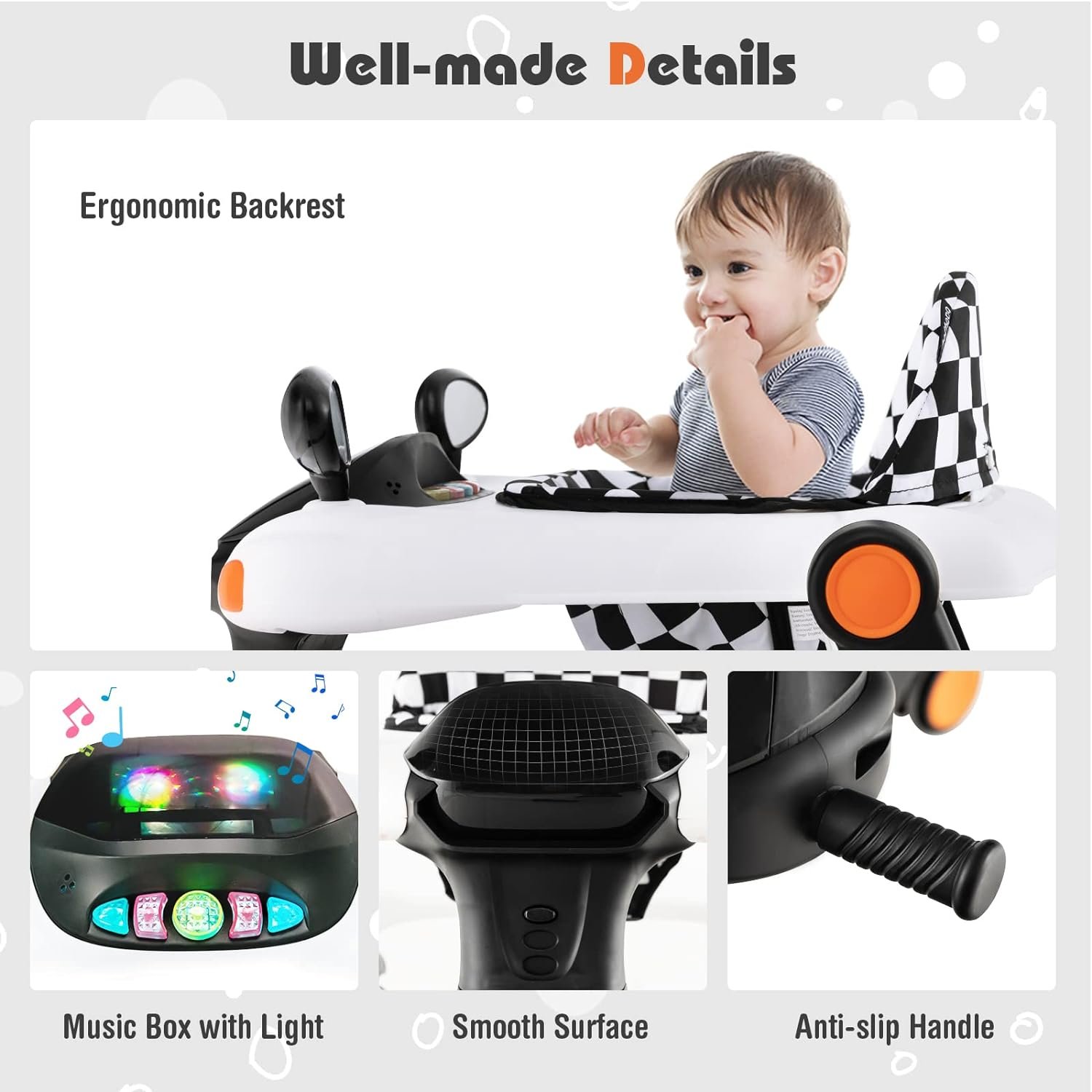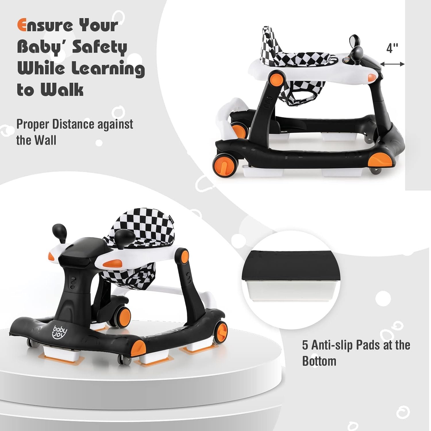 Adjustable Height & Speed: In order to grow with your little one, this multipurpose baby walker comes with 3 adjustable heights so that you are able to adjust it according to your baby’s changing height. Besides, the speed of 2 rear wheels can be adjusted based on your little one’s strength.
