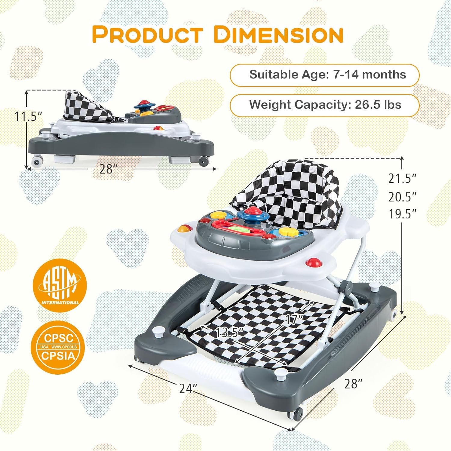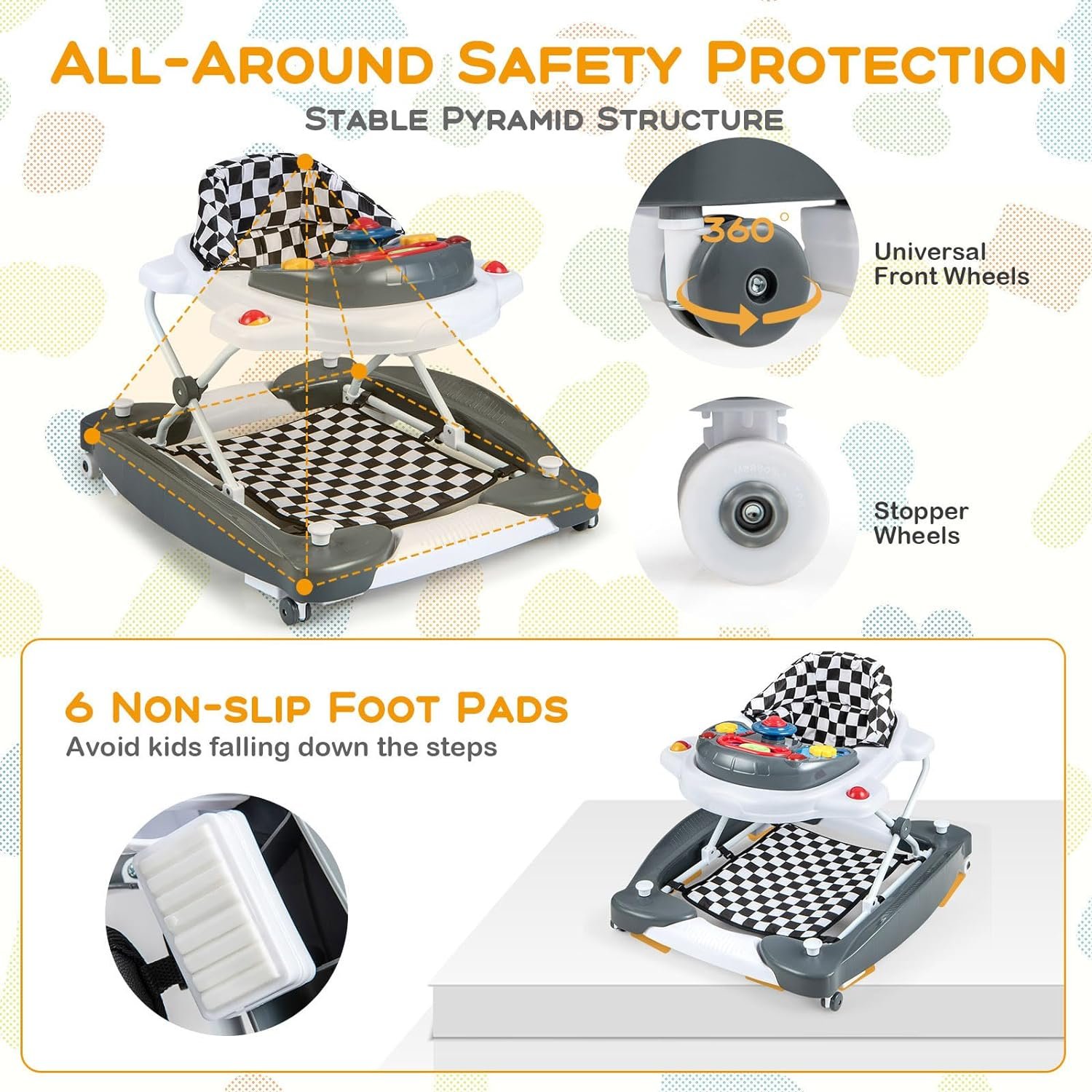 This baby walker can convert to 6 modes, including walker mode, rocker mode, jumper mode, push mode, eating mode and early education mode, adapting to your child’s needs from sitting to walking. The 3-level adjustable height( 14.5″/,15.5”/16.5”) ensures a comfortable and safe walking experience while preventing bowlegs. The detachable music tray adds fun with interactive elements, including rotary balls, lights, steering wheel and horn, instrument panel, keys and knobs. Its safe and stable pyramid construction provides all-around protection for your baby. Meanwhile, it is also equipped with 6 anti-slip foot pads to avoid kids falling down the steps. You can fold it into compact size to achieve easy storage. This scientific baby walker is a perfect investment for your little one’s growth and playtime.
