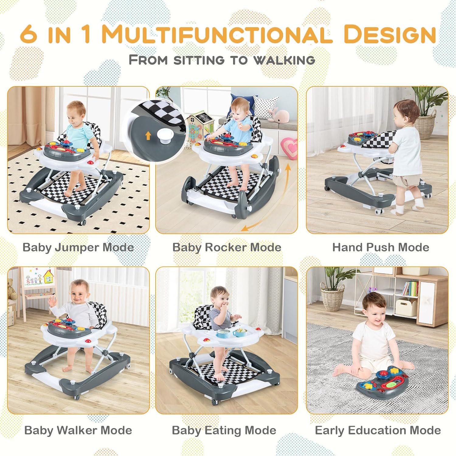 BABY JOY 6-in-1 Baby Walker, Baby Walker with Wheels, Adjustable Height, Music, Lights, Rocker Mode, Baby Activity Walker, Baby Walker and Bouncer Combo, Baby Walker for Boys Girls 6-18 Months (Gray)