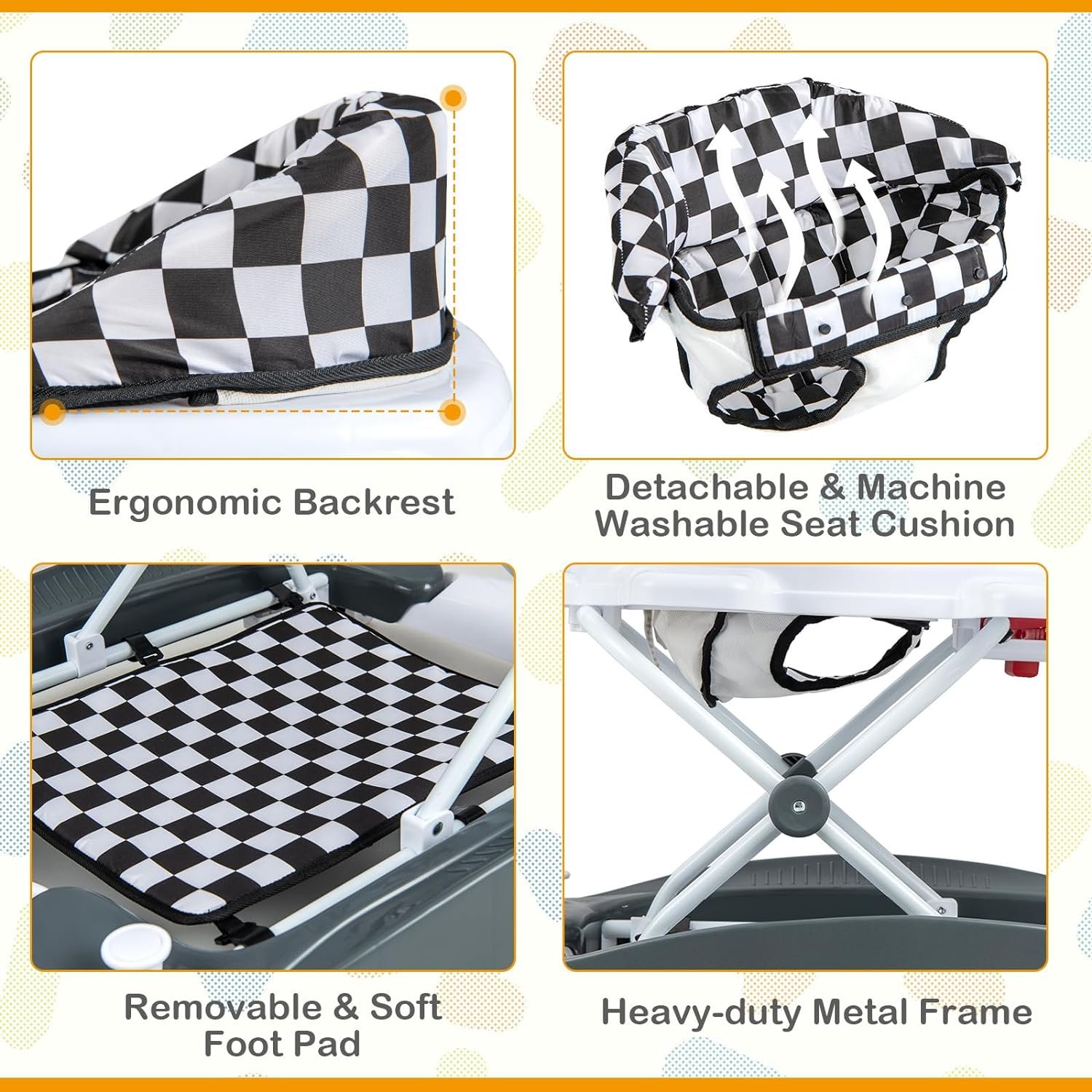【Child-Friendly Material & Design】 Our baby walker is made of high-quality and safe PP material, ensuring peace of mind with every touch. The smooth and rounded body is free of edges and burrs. The 95° ergonomic high backrest protects baby’s spinal development. The comfortable and breathable cushion is removable and machine washable for convenient cleaning.