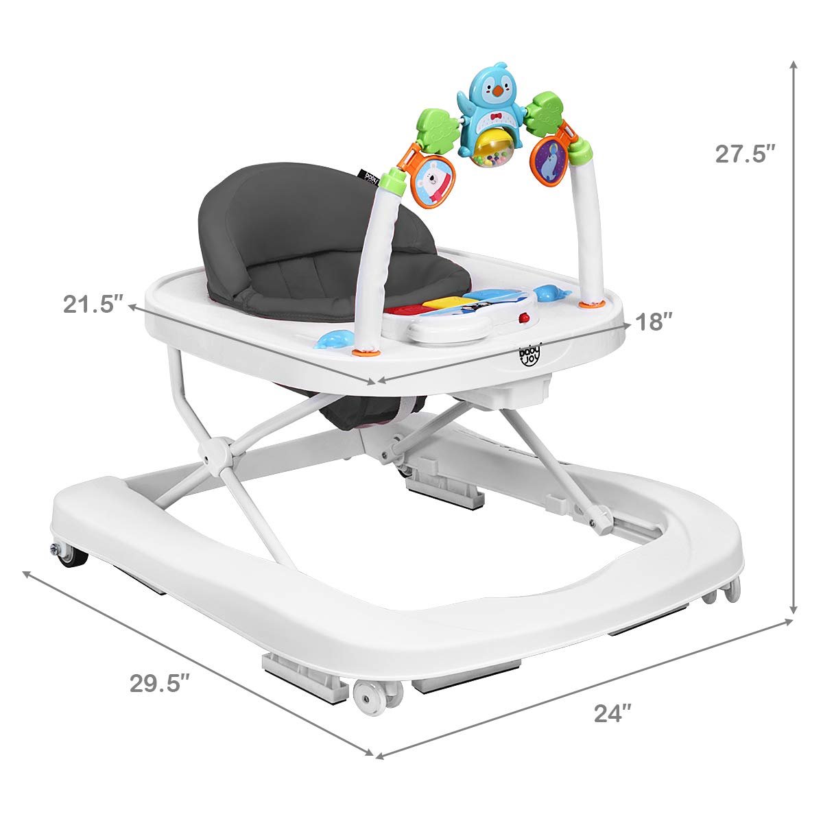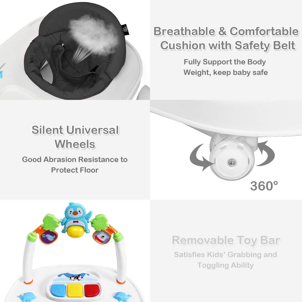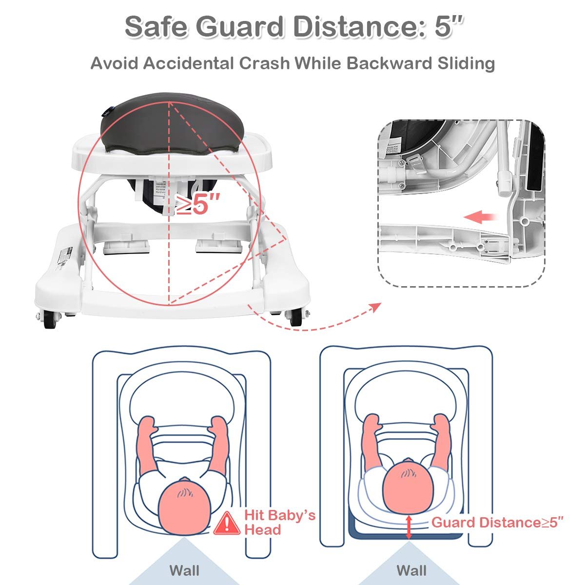 2-in-1 Baby Walker: BABY JOY baby walker can be easily converted from the seated one into the walk-behind walker with the detachable bar and it has the safe guard distance 5” to avoid accidental crash while backward sliding. The optional baby learning walker helps apply balanced force to both feet so as to effectively avoid bow-legged walking.