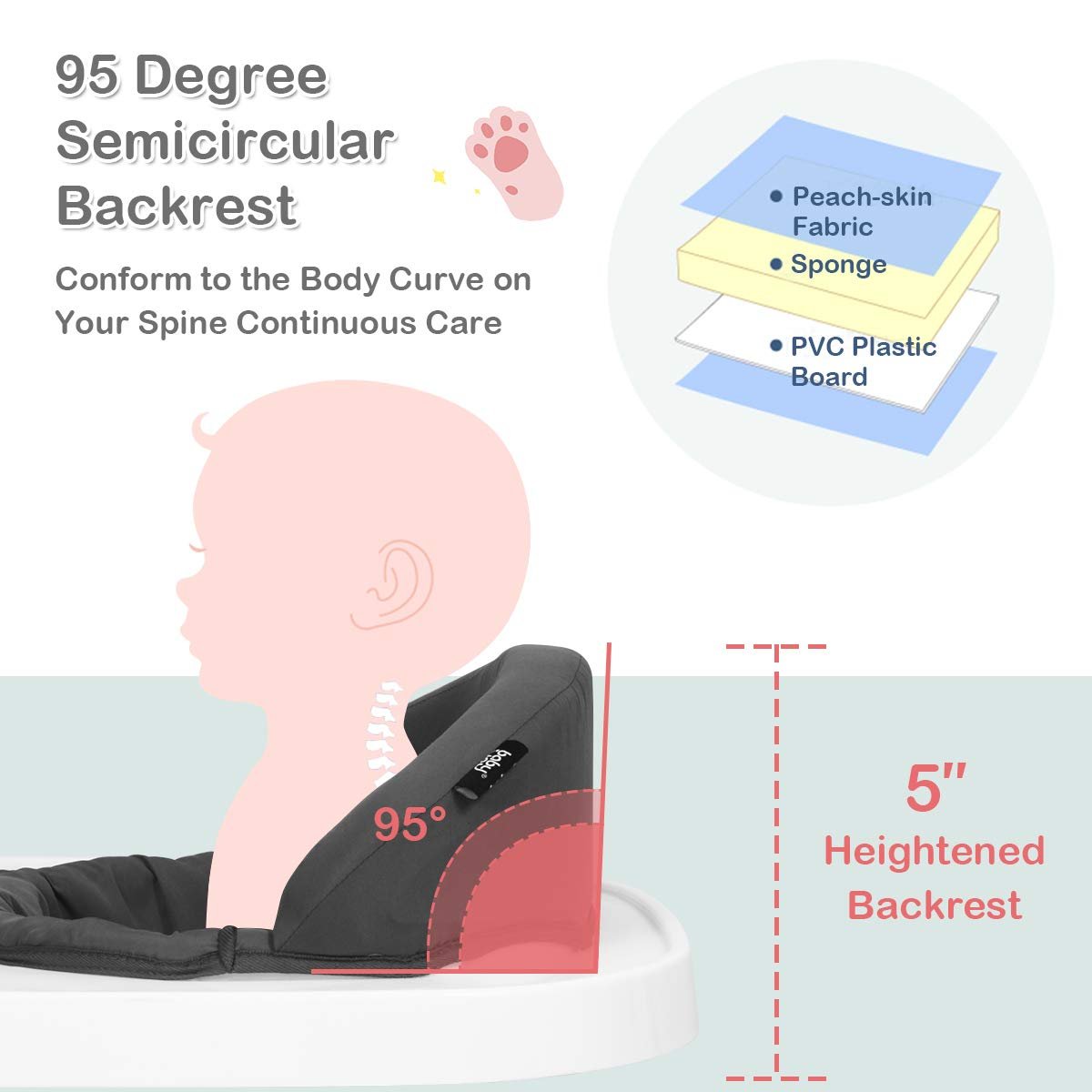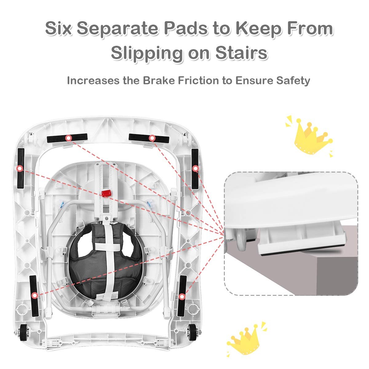 Anti-Rollover U-Shaped Structure: Different from the circular base which will let baby disorientate and giddy, the wide U-shaped base can bring complete psychological hints of direction and won’t easily turn over. And the six separate pads at the bottom effectively keep from slipping on stairs and increase the brake friction to ensure safety.