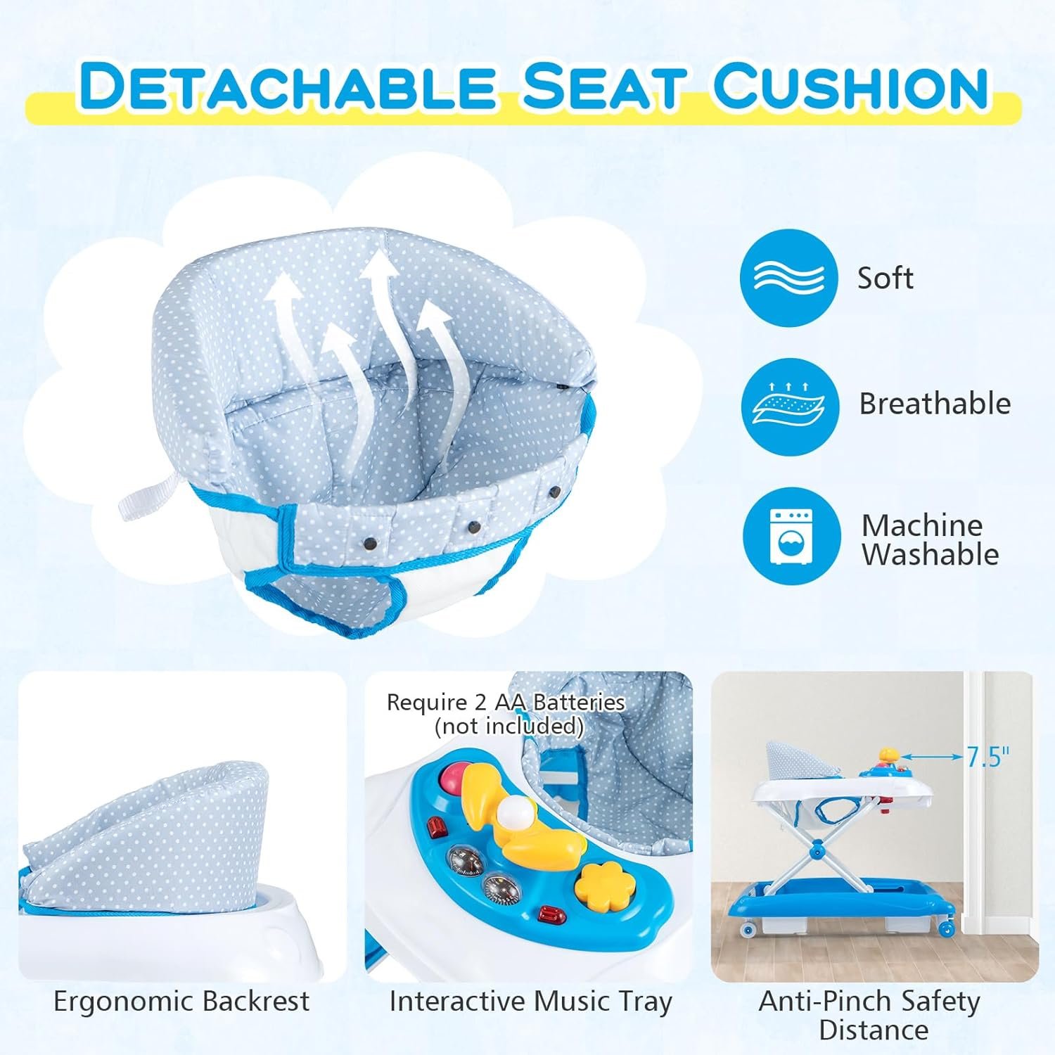 【Child-Friendly Material & Design】 Our baby walker is made of high-quality and safe PP material, ensuring peace of mind with every touch. The smooth and rounded body is free of edges and burrs. The 95° ergonomic high backrest protects baby’s spinal development. The comfortable and breathable cushion is removable and machine washable for convenient cleaning.