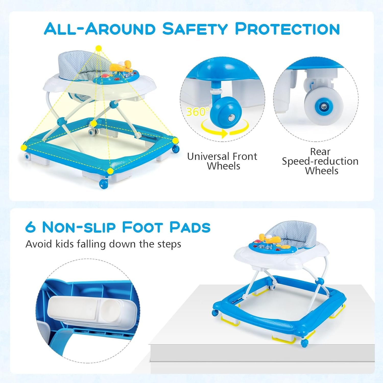 【Safety Comes First】 This ASTM & CPSIA certificated baby walker features 6 anti-slip pads (auxiliary brakes) to eliminate the risk of falling down stairs or rolling down slopes. With a 7.5” gap reserved between the front of the walker and the wall, it prevents finger pinching for a safe world exploration. The universal front wheels provide flexible and smooth steering, while the speed-reduction rear wheels ensure safe control.