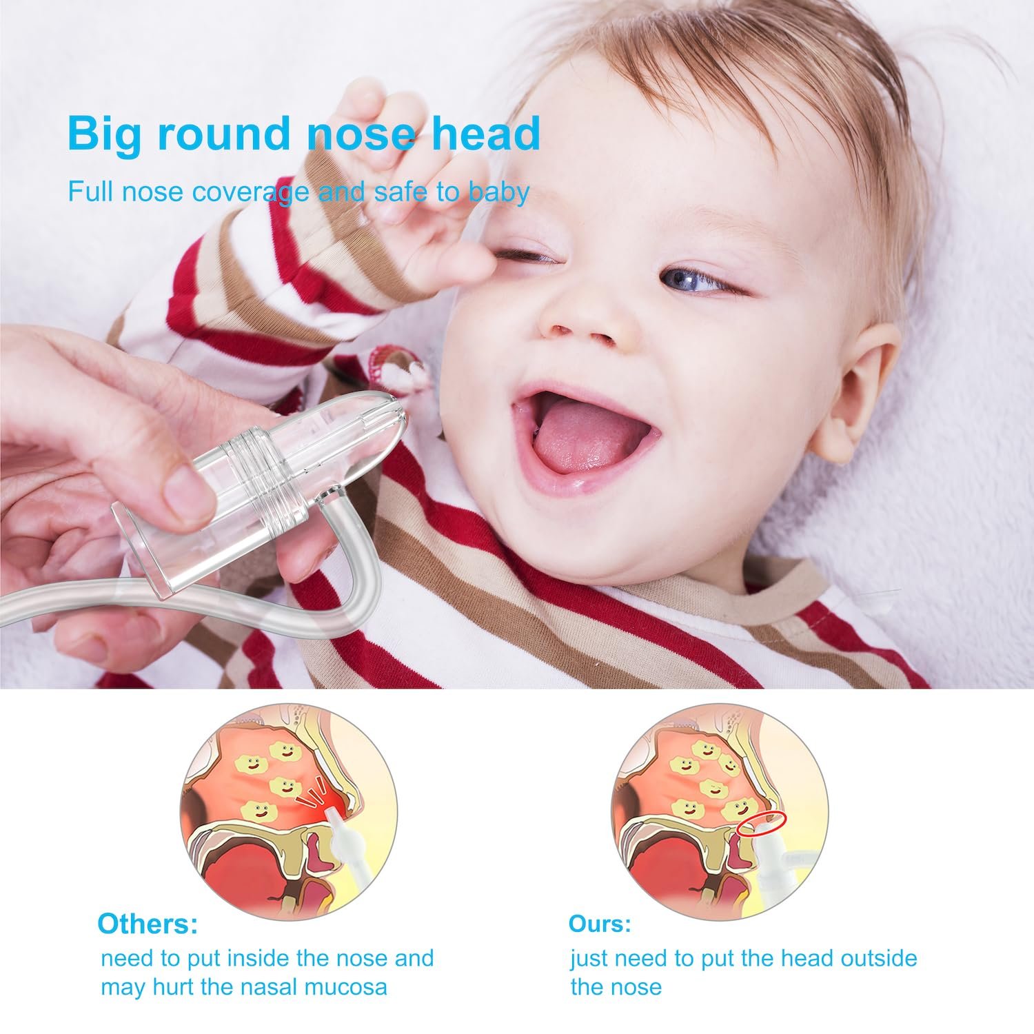 š„SAFE: the nose head is round and bigger than baby’s nose so it won’t go inside the nostril and hurt the mucosa. The material is the highly quality PP+PS+medical-grade silicone, ZERO smell and harm to baby.