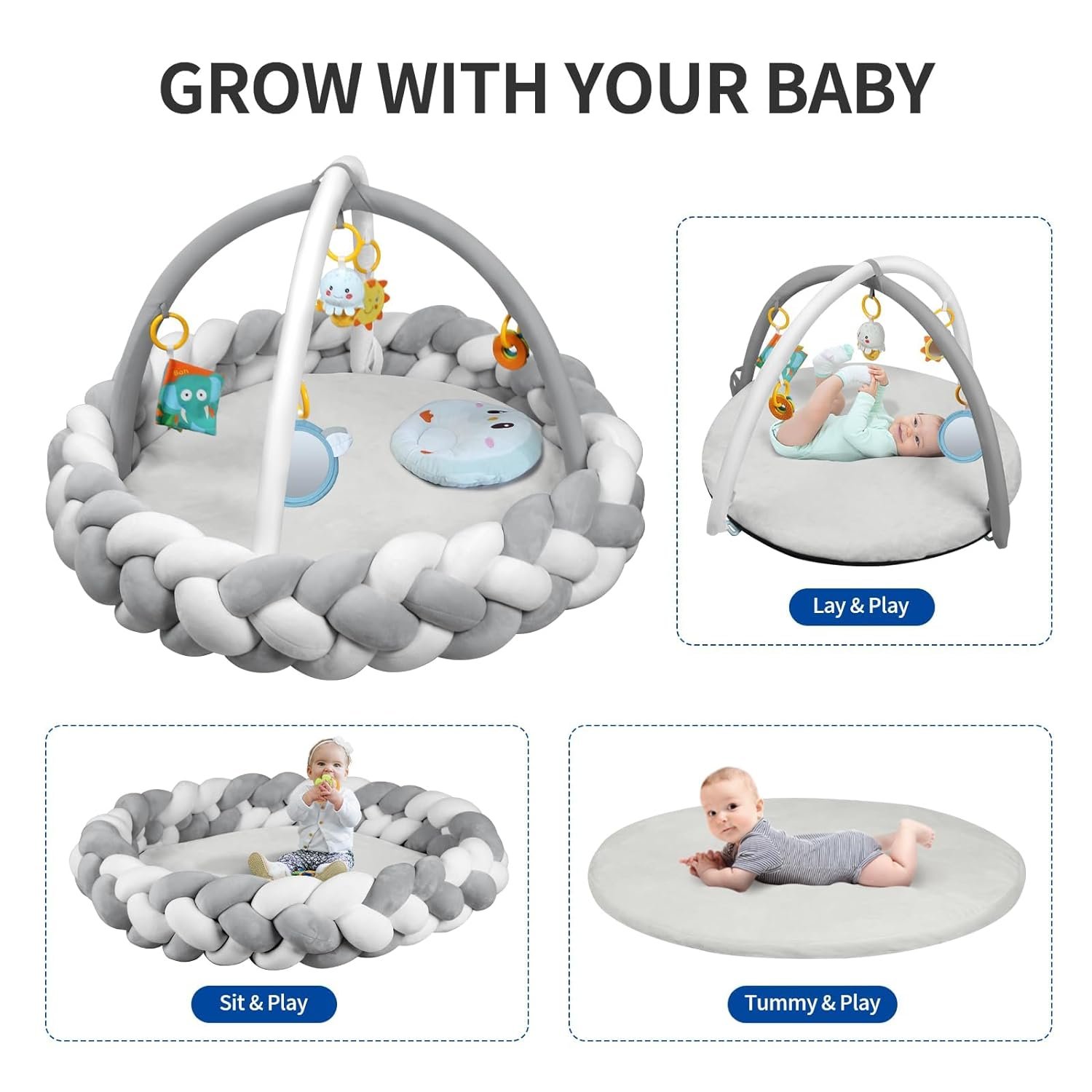 ALL-IN-ONE MAT: The play gym entertains baby with different modes, lay & play, tummy time, sit & play. Made of high-quality material, this activity mat with a large size is incredibly soft for baby lying, playing, sitting and crawling, which provides the utmost comfort for baby’s delicate skin.