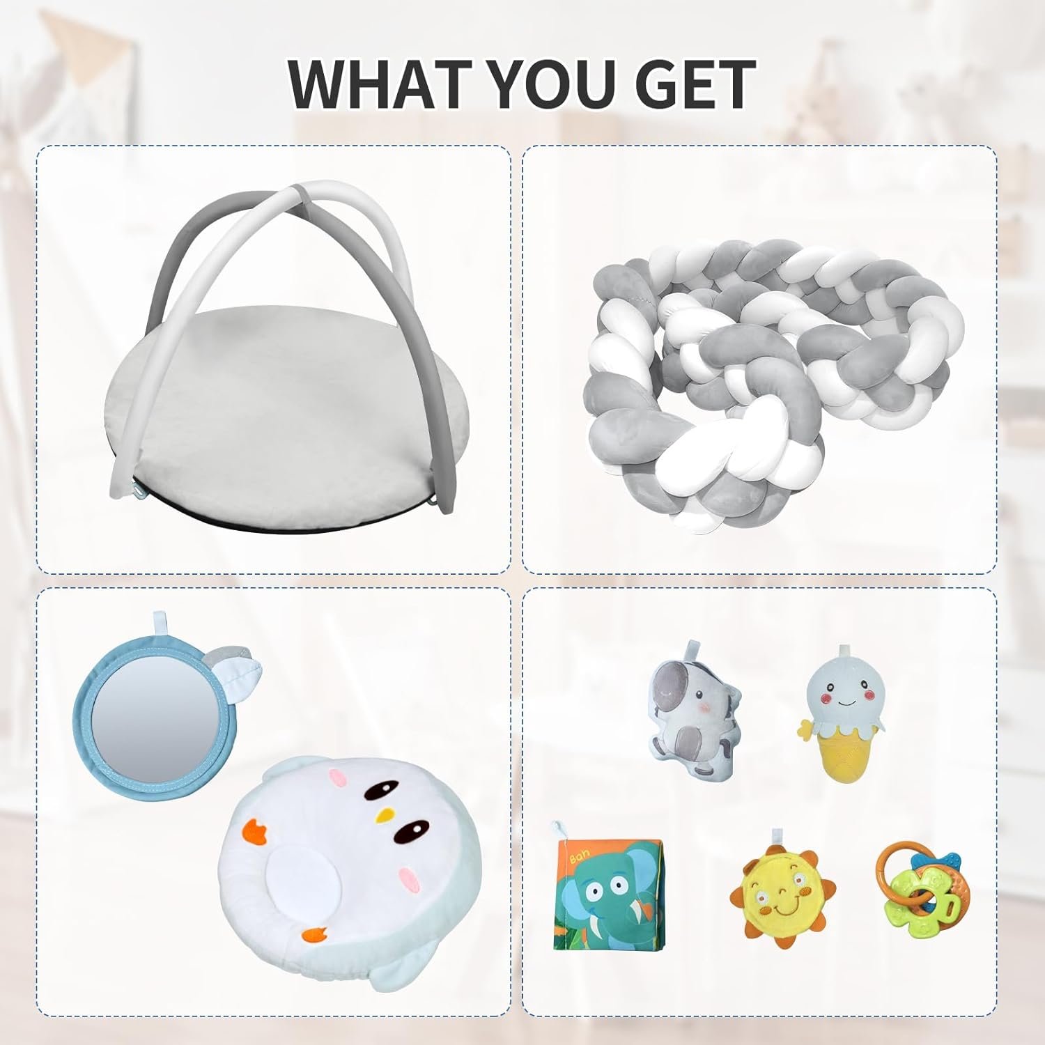 Let baby discover himself in mirror, and promote the development of visual cognitive ability. BPA-free teethers help soothe and reduce baby’s discomfort for teething. Soft ice-icream shape toy and horse theme toy with ring bell, beautiful shape and pleasant sound of bell, promoting baby’s touch and hearing. A cloth book with animal theme is extremely soft, and each page has a new animal world to explore which features a nice rustle sound.