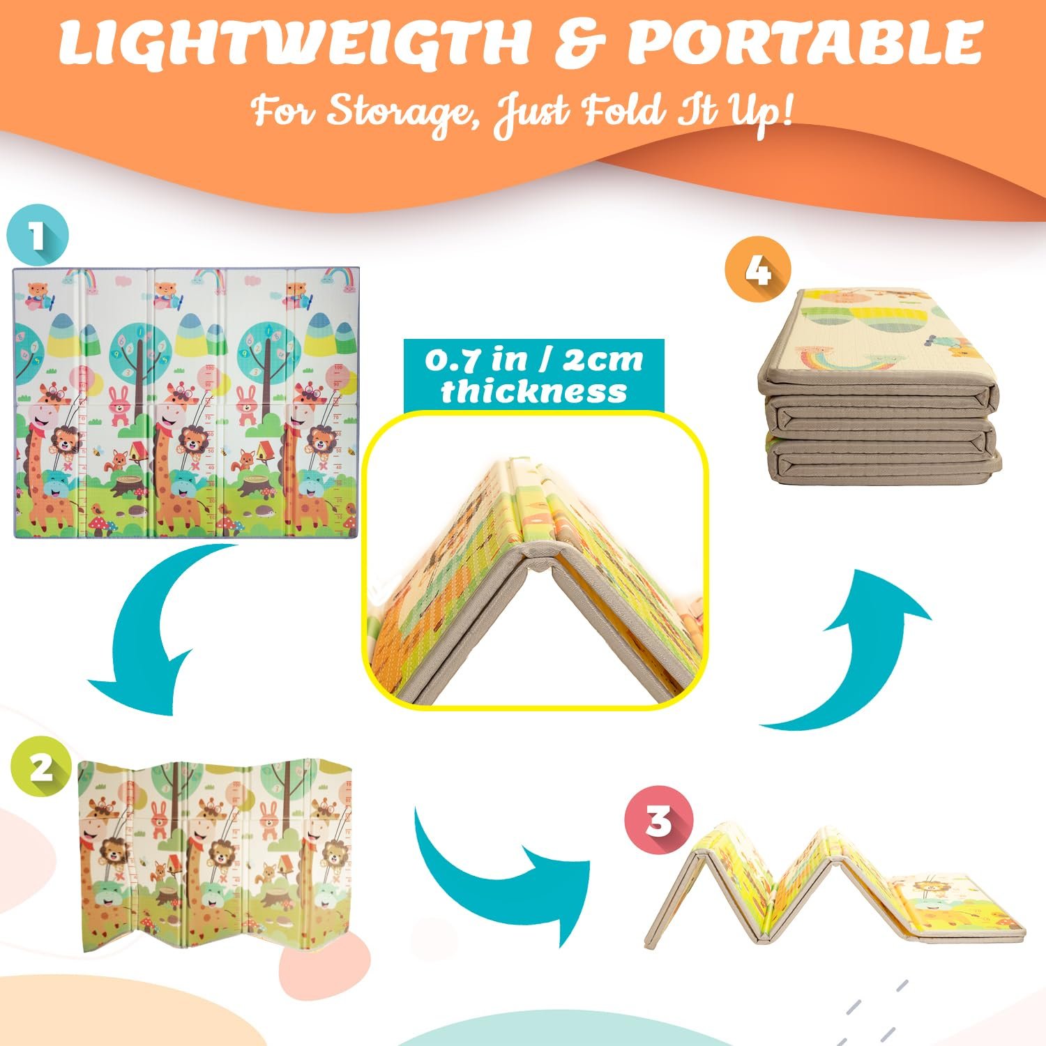 FOLDABLE PORTABILITY: Designed for convenience, our foldable baby play mat is easily foldable and comes with a travel bag. Take your little one’s playtime anywhere, effortlessly, with this portable play mat. Simply fold and store our folding play mat away when not in use, keeping your space clutter-free.