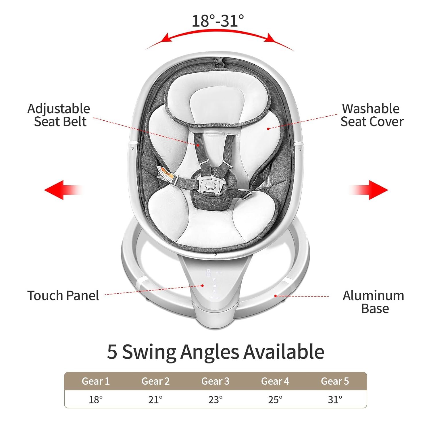 Smart Touch Panel: You can choose the appropriate swing speed, music, or timer function by Touch Panel. Upgraded load-bearing base, safer and more assured.