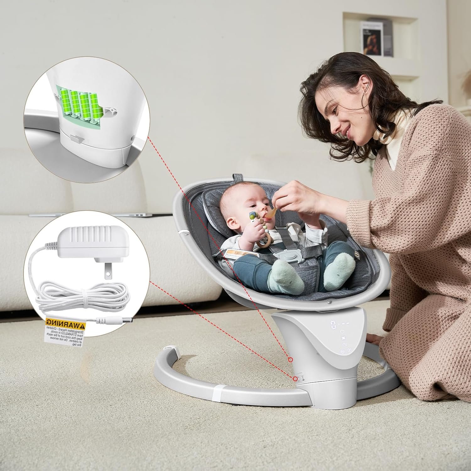 Indoor Use: The baby swing can be powered by adapter or battery. Requires 4 AA batteries(not included).