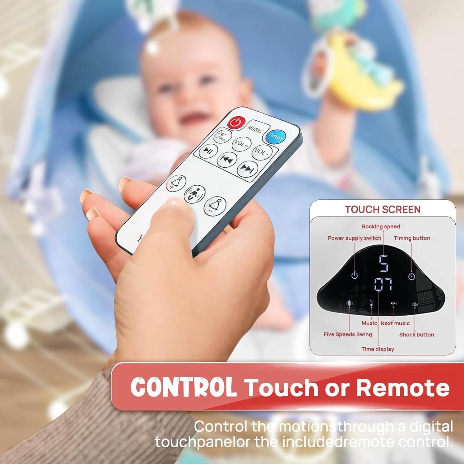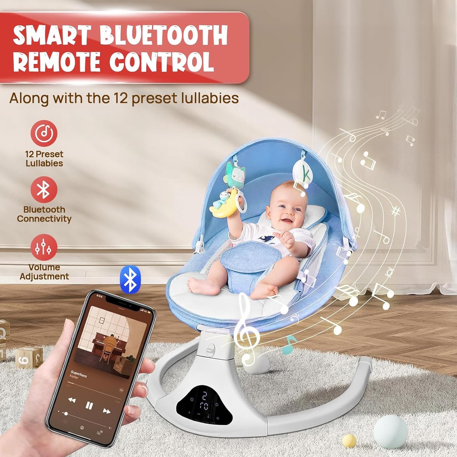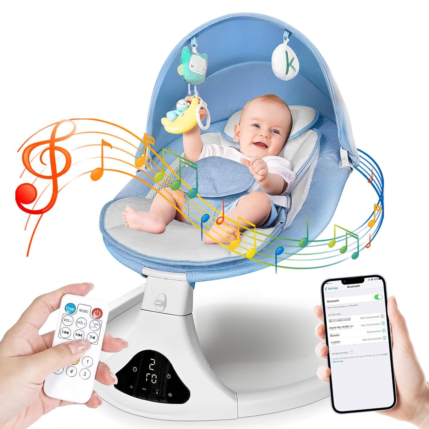 【Bluetooth Player Function】This baby swing features a built-in Bluetooth speaker, allowing you to enjoy your favorite music wirelessly from your smartphone.The speaker delivers clear and immersive sound, creating a relaxing and enjoyable atmosphere for you and your baby.