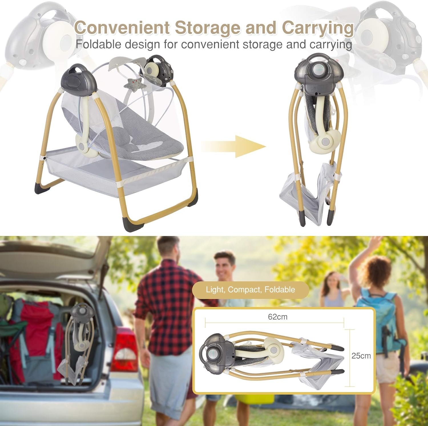 【TIMER FUNCTION & TWO POWER OPTION】Timer functions range from 15 mins, 30 mins, 45 mins, and 60 mins. The default is 60 mins. Two power supply methods: USB cable (included) or Batteries (not included). Baby Swing fold up dimensions: 24.4”(L) x 22.2”(W) x 9.8”(H). Seamless sturdy steel frame for baby birth up to 25 lbs.