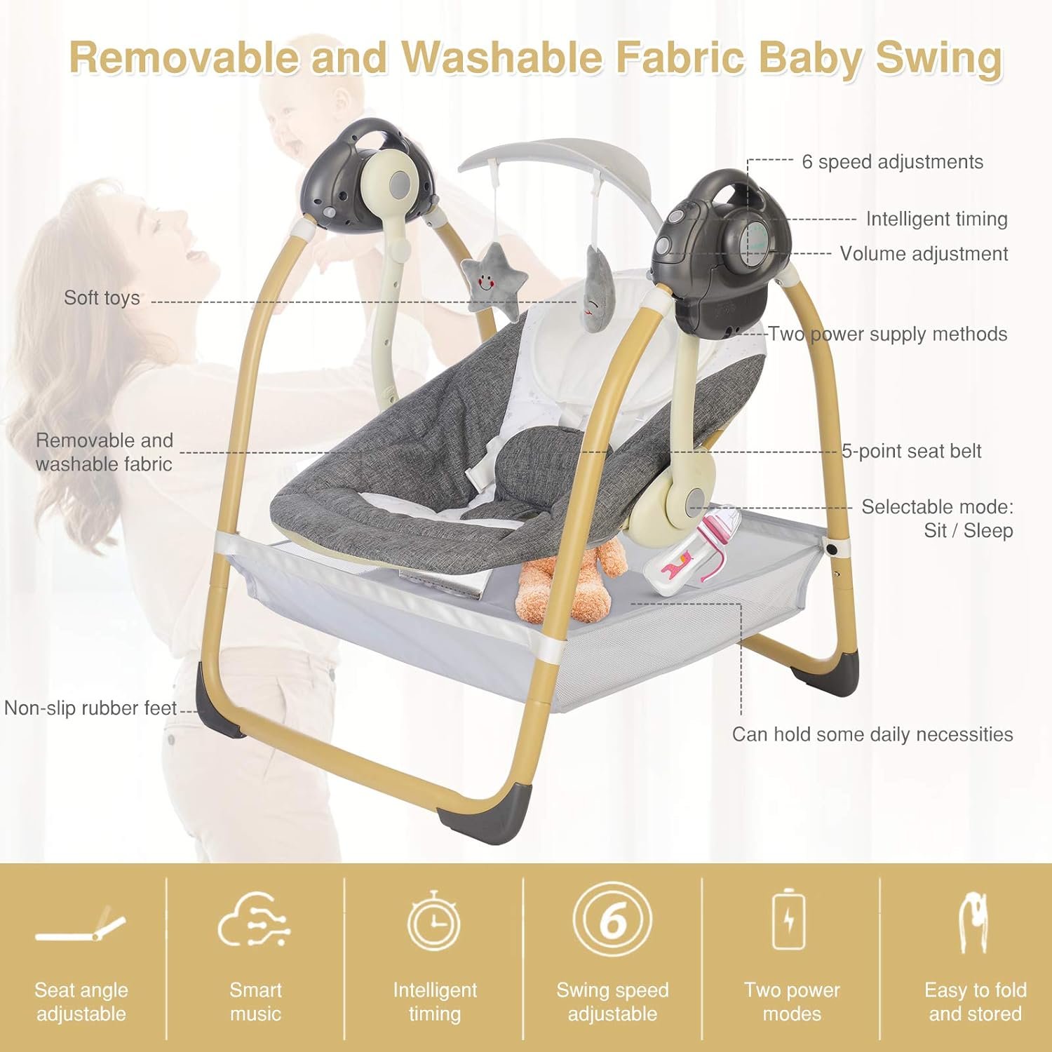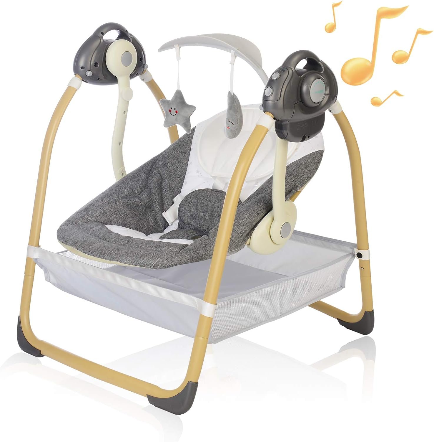 【ENTERTAINMENT & PRACTICAL ACCESSORIES】Baby Swing Comes with smart music and nature sounds, an engaging mobile with two soft toys hanging on a leaf-shaped toy rack. Removable nylon bag under the swing for holding infant’s daily necessities. Removable ventilated bed nets to protect baby from bites.