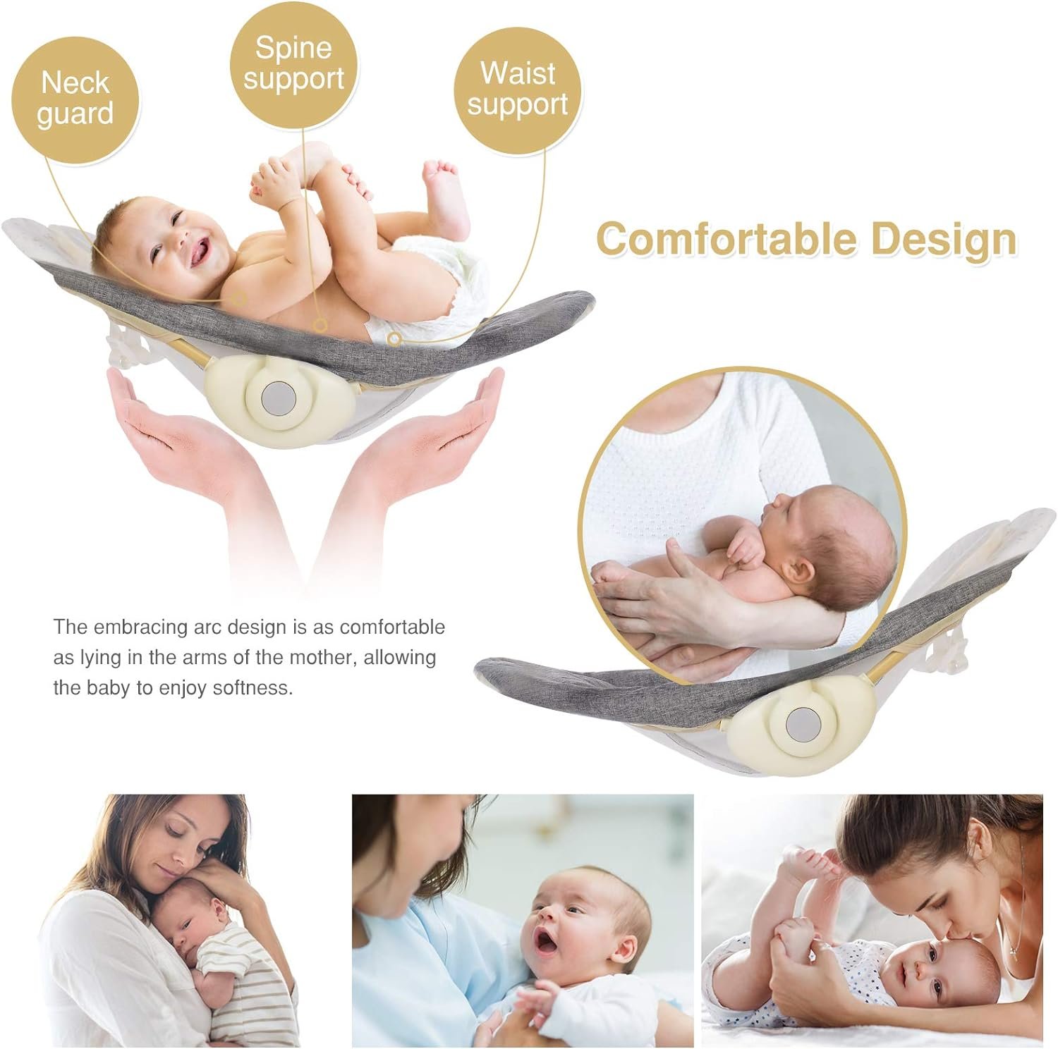 【COMPACT & PORTABLE INFANT SWING】Ergonomics seat and plush head support for the baby just like lying in mother’s arms, all made of skin-friendly and machine washable fabric, two recline modes for baby playing at mother aside. Legs are foldable for easy storage and travel as well.