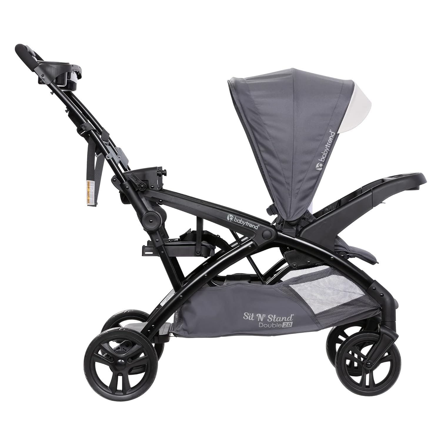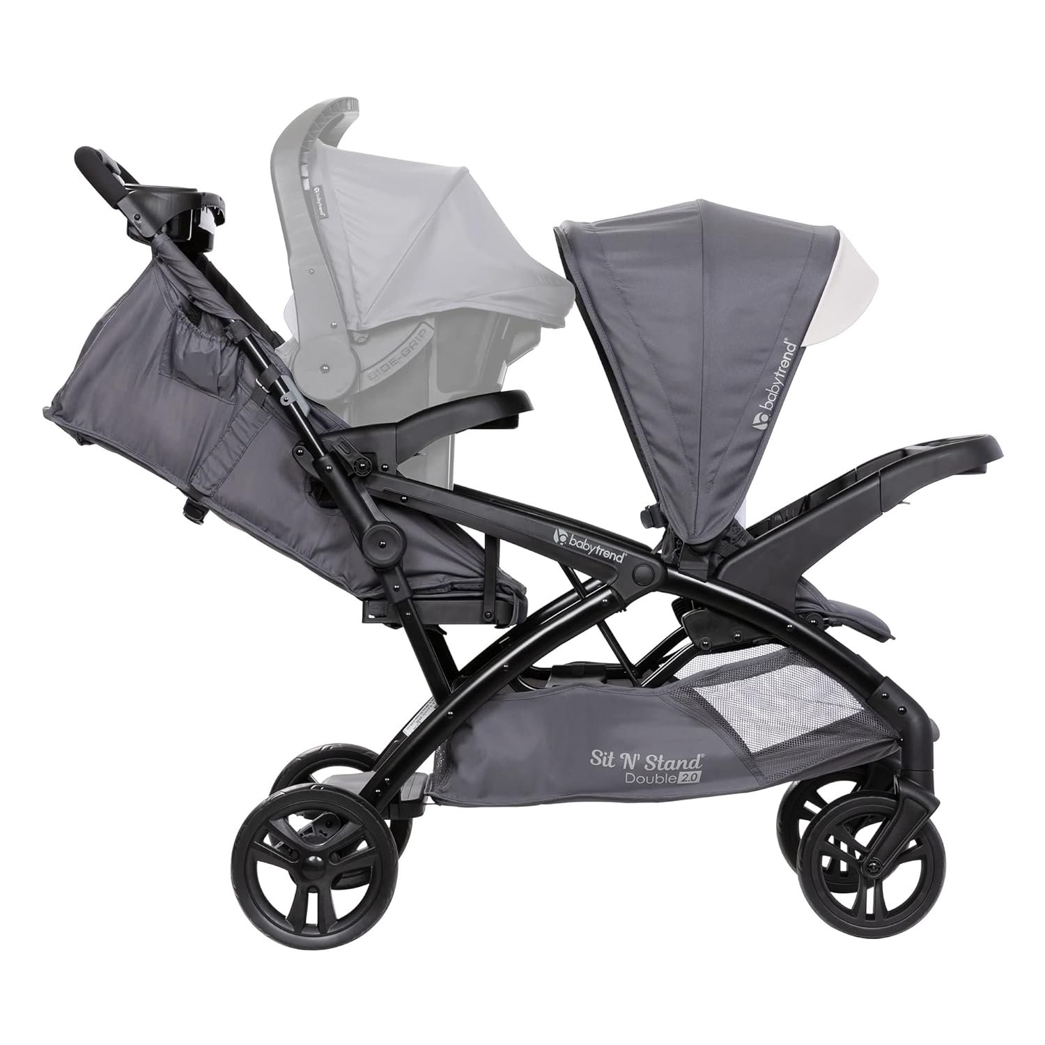 Bring your child along on the trip safely using the Sit N’ Stand double stroller with storage compartment and EZ-Lift infant car seat; Color: Magnolia