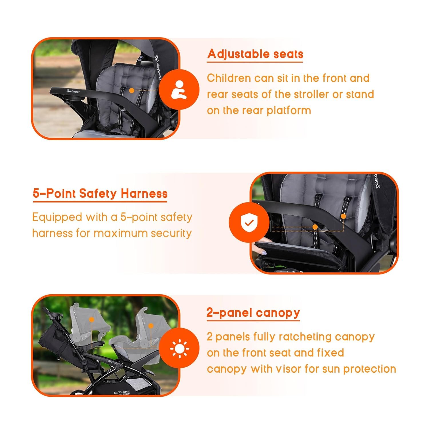 Maximum Sun Protection: Includes 2 panels with fully ratcheting canopies on the front and a fixed canopy with a visor for maximum sun protection to be ready to roll no matter the season