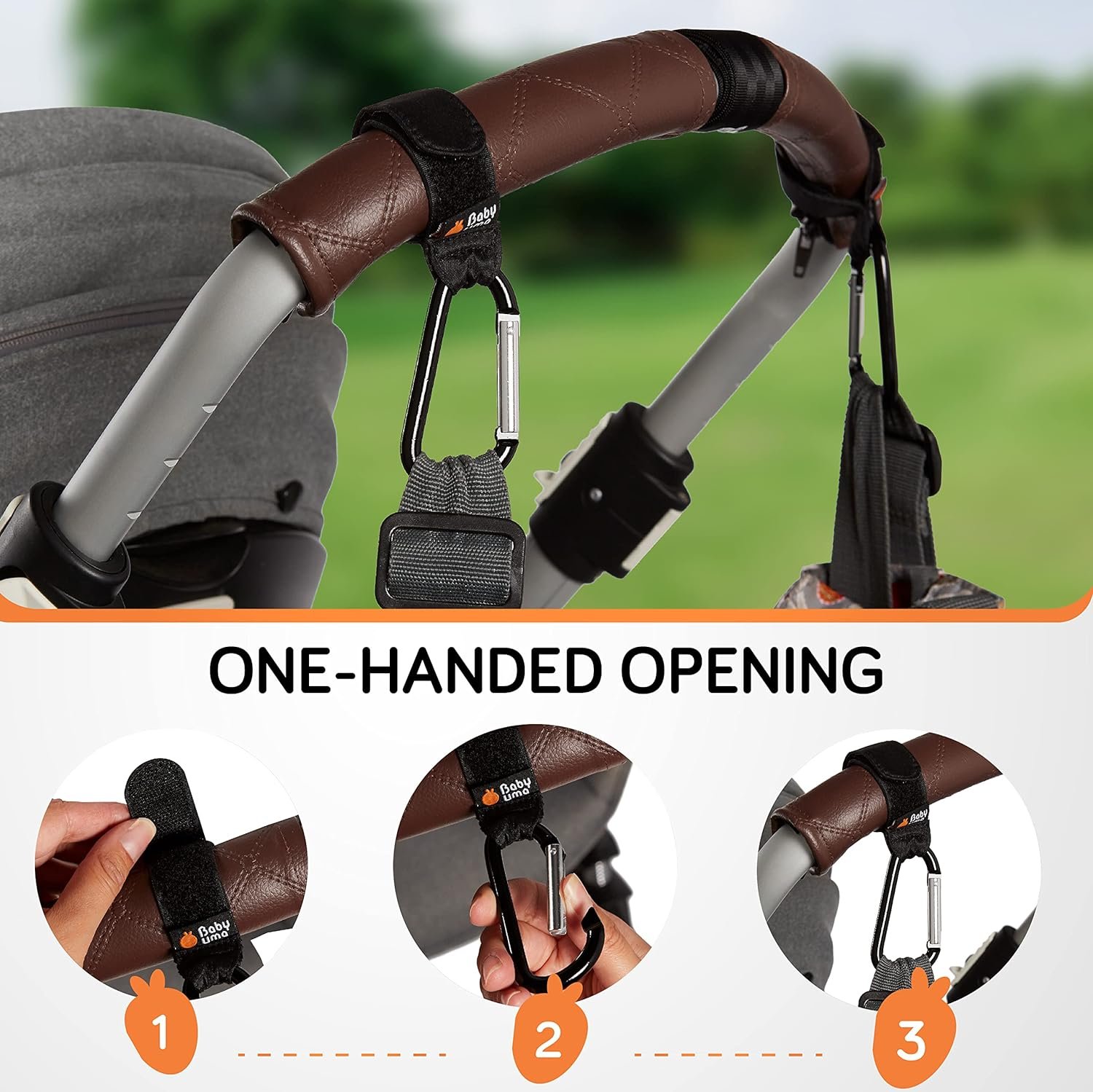 One-hand opening – Thanks to the one-hand opening, the stroller hooks for diaper bags are an absolute piece of cake to attach and remove, even when you’ve got your hands full.