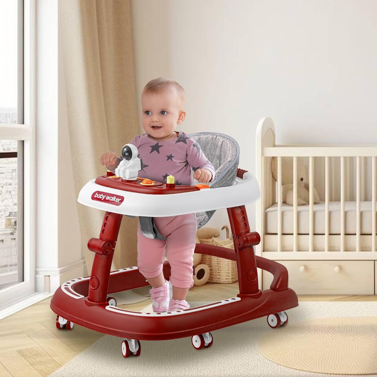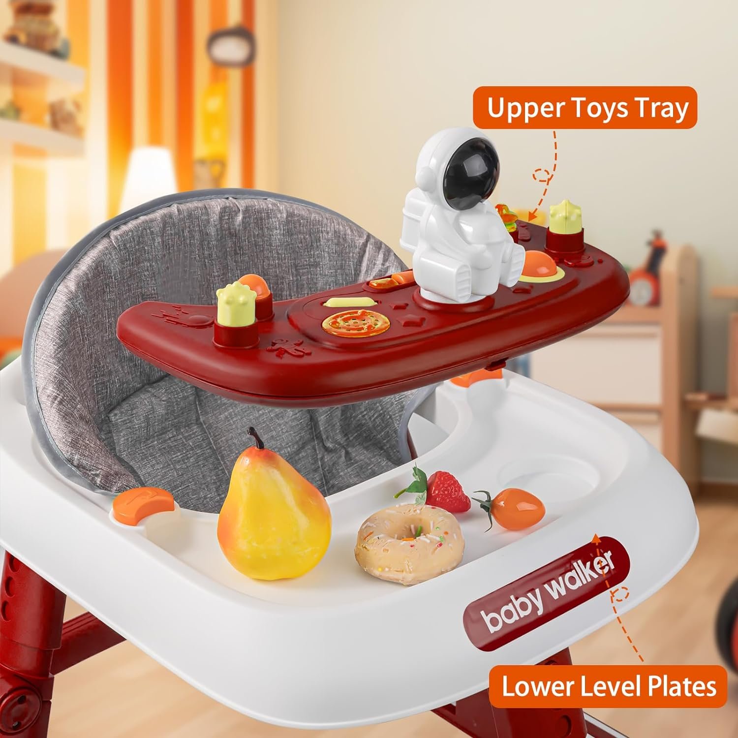 🌺【Dual-use Detachable Tray Design-The baby walkers for girls is designed with dual-use tray, the upper layer is a multi-functional musical toy tray, which can be used as baby activity center, a variety of educational and entertainment toys to develop baby’s intellect, and features astronaut toys to stimulate baby’s interest in exploring. The lower layer is an edible material plate, easy to clean, to ensure the safety of baby’s diet.