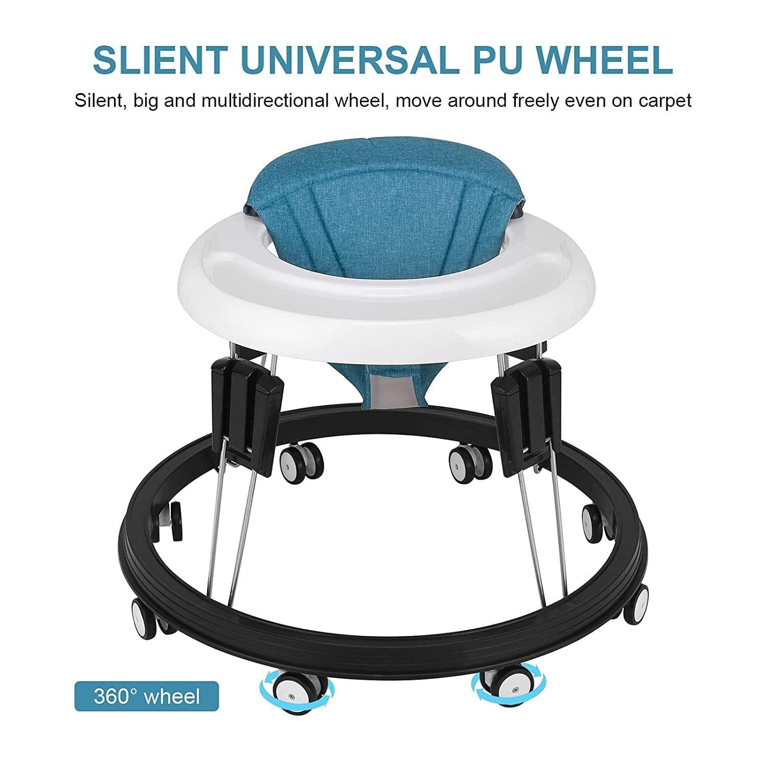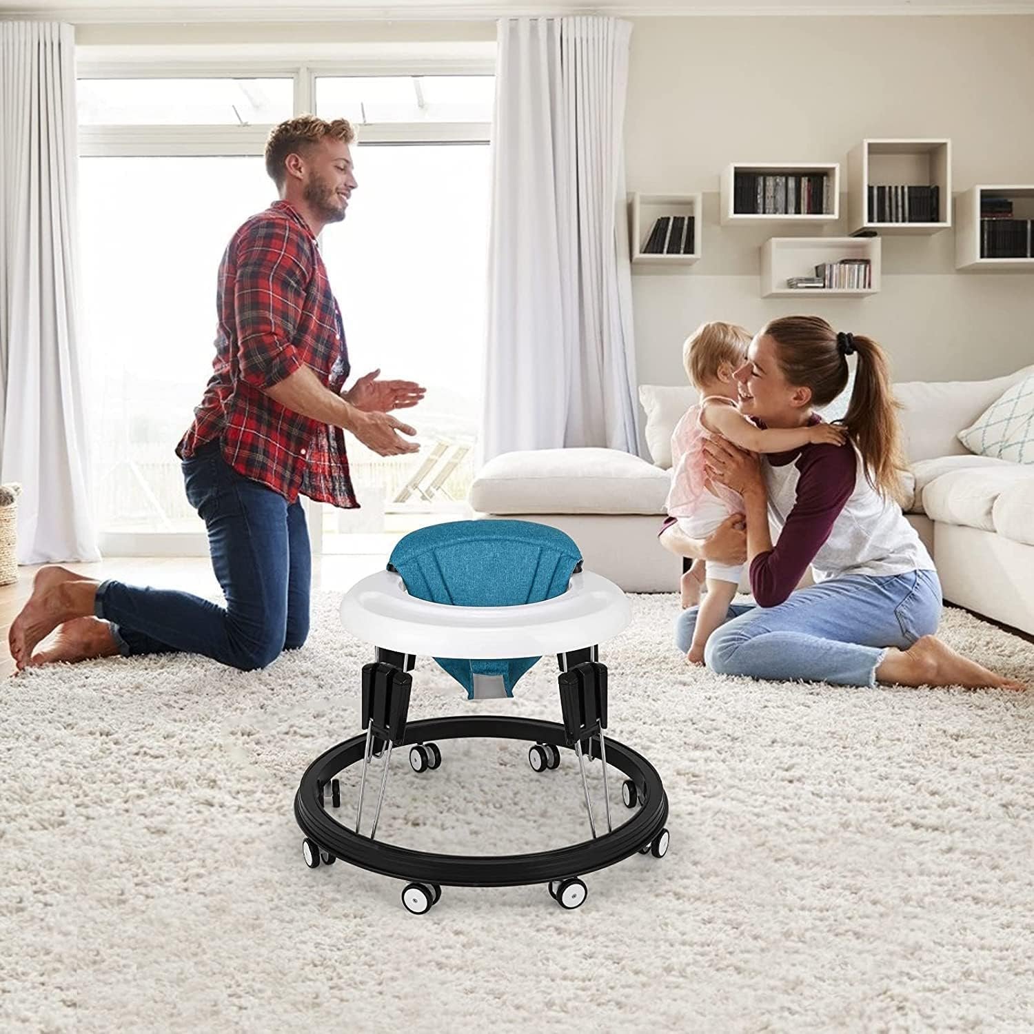 The baby walker is ready for your baby to buckle up and have fun while learning to walk! Your little one can stretch their legs while being entertained with toys that provide sensory and tactile stimulation, and help develop gross motor skills, thinking and problem solving. Featuring a removable and washable seat pad, a removable toy, four different height adjustable seat and easy-fold frame design, the baby walker combines quality, convenience and fun for you and your little one. It is deserved to have one.