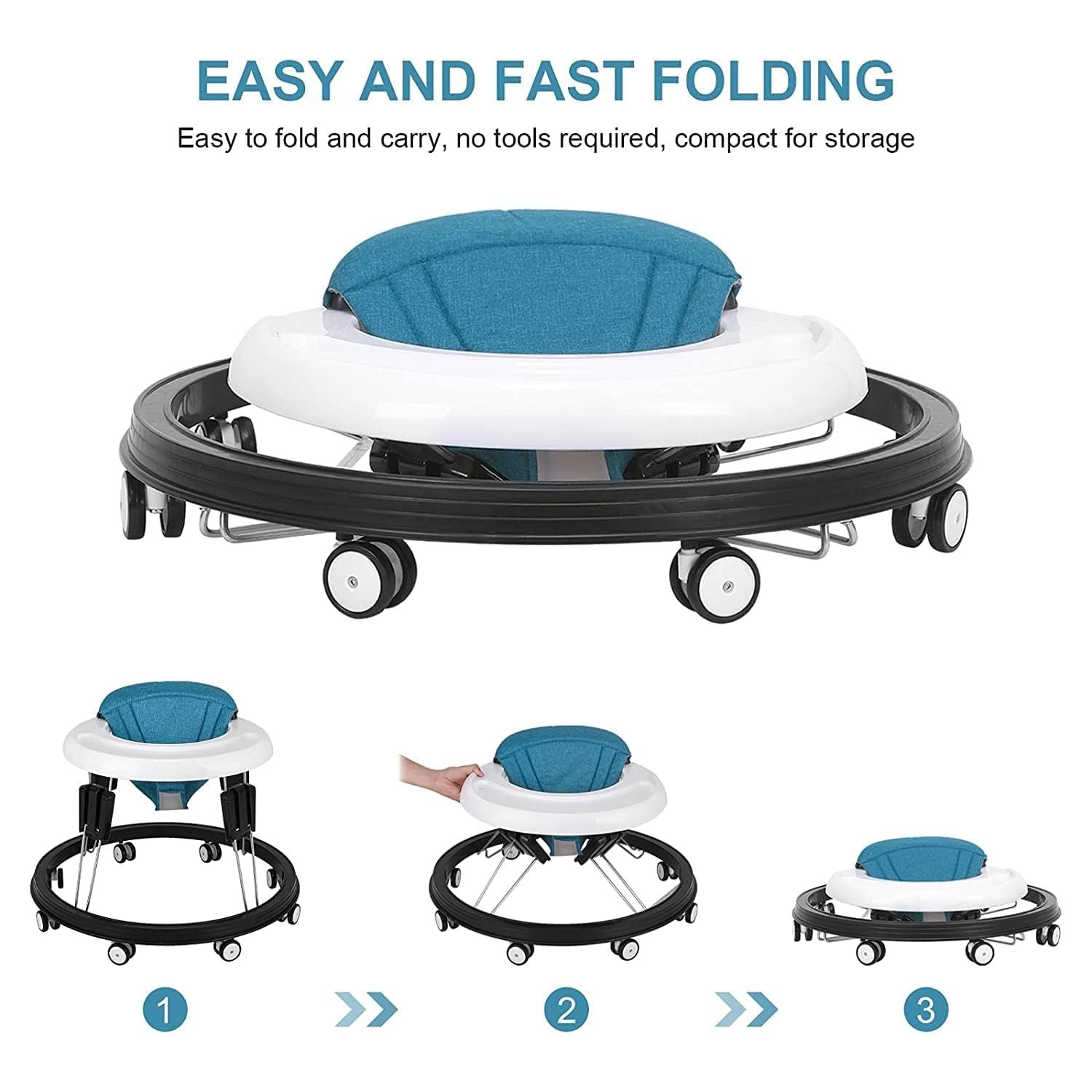 【Easy Folding & Unfol】The baby Walker can be folded down and fold flat, Installation Free. It is a small size and easy to carry and store. Round design with 8 universal wheels work on floors or carpets for easy moving. 4 strong stainless steel legs. Bring full convenience to your life.