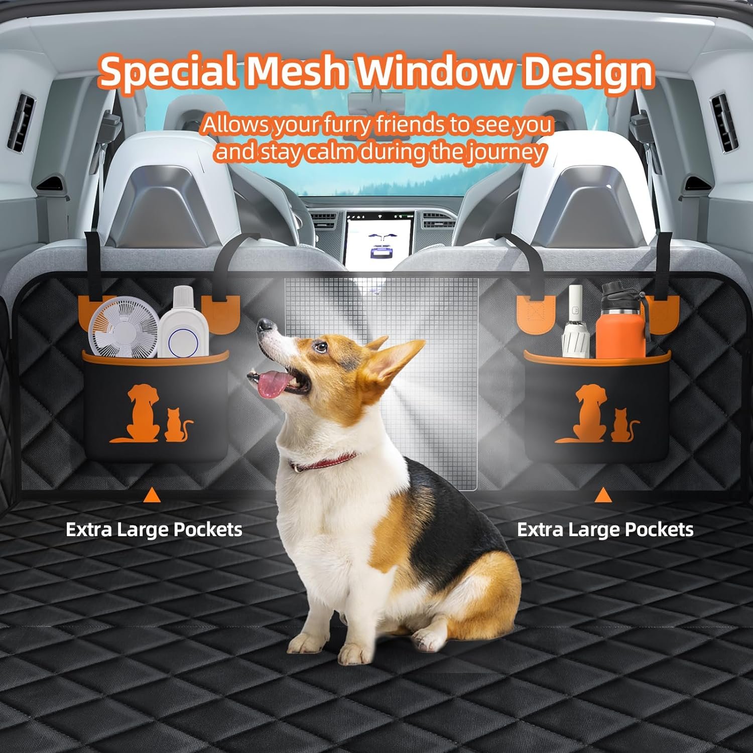 【Multifunctional Backseat Extender】2 large storage pockets of the seat extender for dogs are easier to store your phones, your pet’s toys, treats, and other essentials and foldable bowls. And a mesh window that allows your pets to see you and stay calm during the journey.