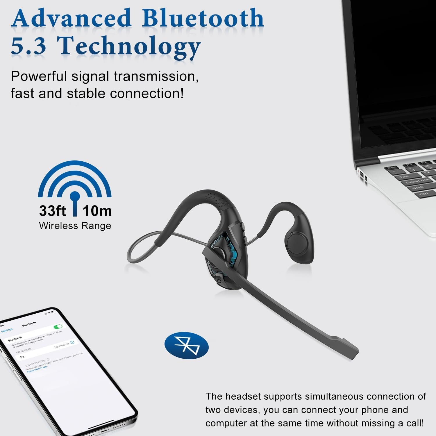 🚀【Stable and Powerful Dual Connection】Wireless headphones with advanced Bluetooth 5.3 technology, long-range audio transmission up to 33 feet (10 meters), faster signal transmission and more stable connection. Once connection is successful, it will automatically connect to the last connected device. Bluetooth headphones can connect two devices at the same time, ensuring no calls are missed. Bluetooth headset is widely compatible with mobile phones/PC/computers/laptops/tablets/iPad, etc.
