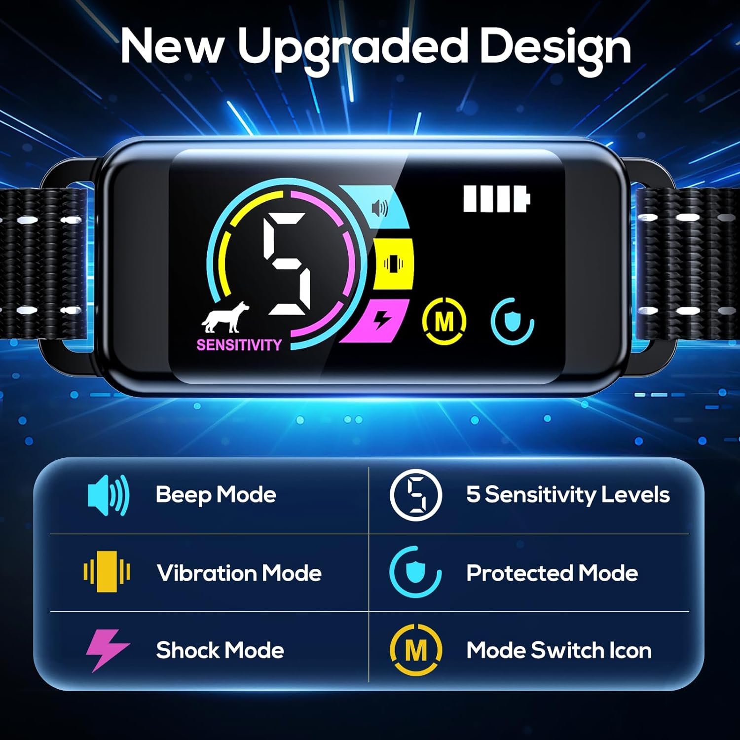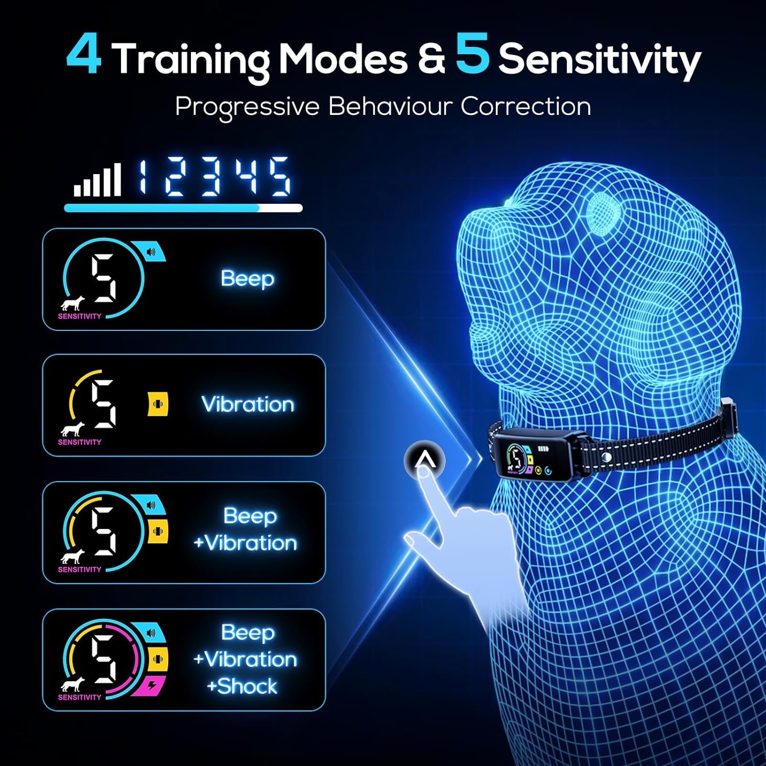 【4 Humane Modes & 5 Sensitivity Levels】The shock collar provides 4 training modes. No shock mode: beep, vibration, beep+vibration; Shock mode: beep+vibration+shock.5 level sensitivity adjustable, suitable for various environments. Our dog training collar teaches your puppy to relax and trust instead of fear. Achieve effective behavior modification through its customizable training modes.