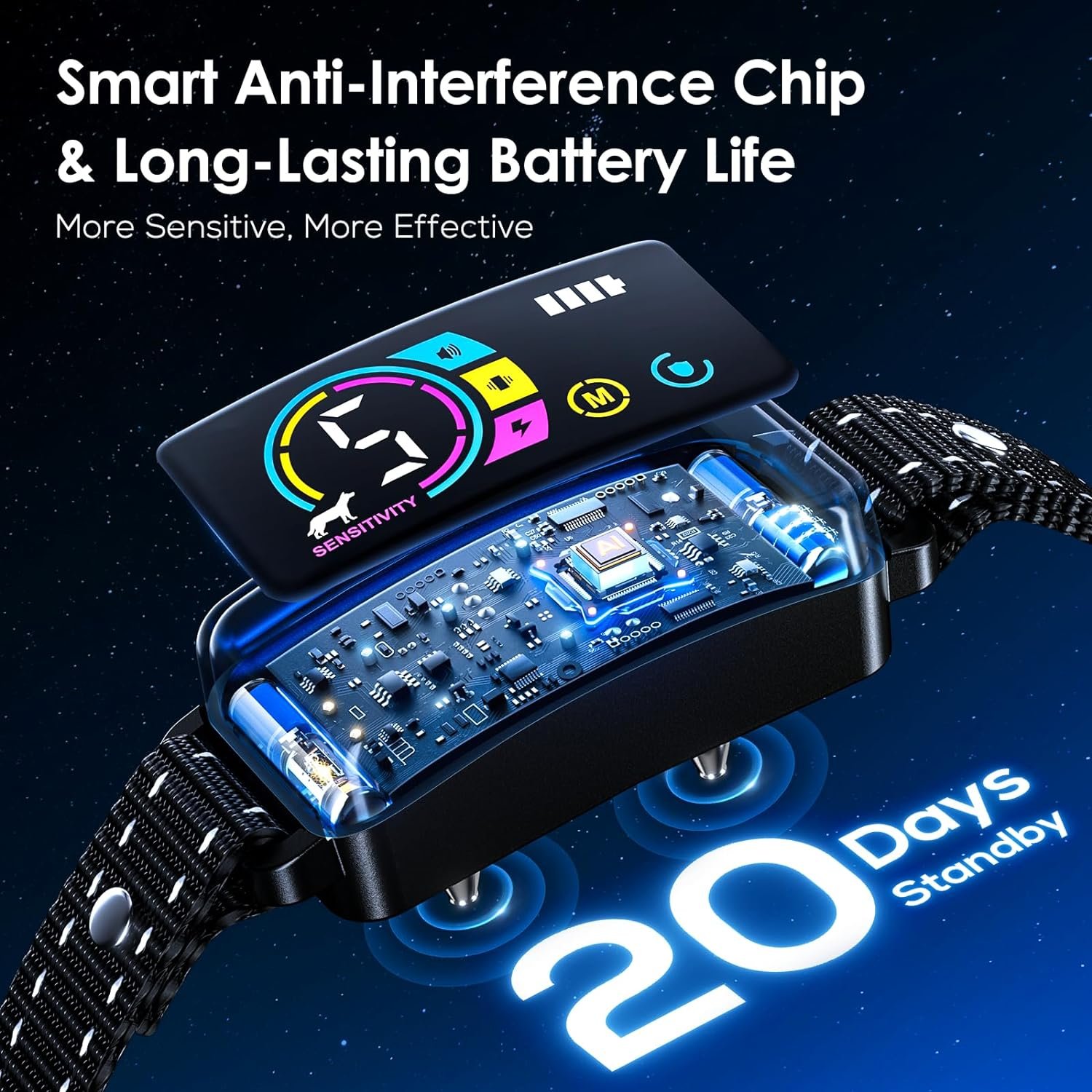 【No False Triggers & Waterproof】With an advanced AI intelligent dog bark recognition chip and motion detection technology, the barking collar activates only when movement and barking are detected, eliminating outside noise or false triggers from neighboring pets. In addition, the anti barking device is IP67 waterproof, making it resistant to rain, snow, and mud splashes.