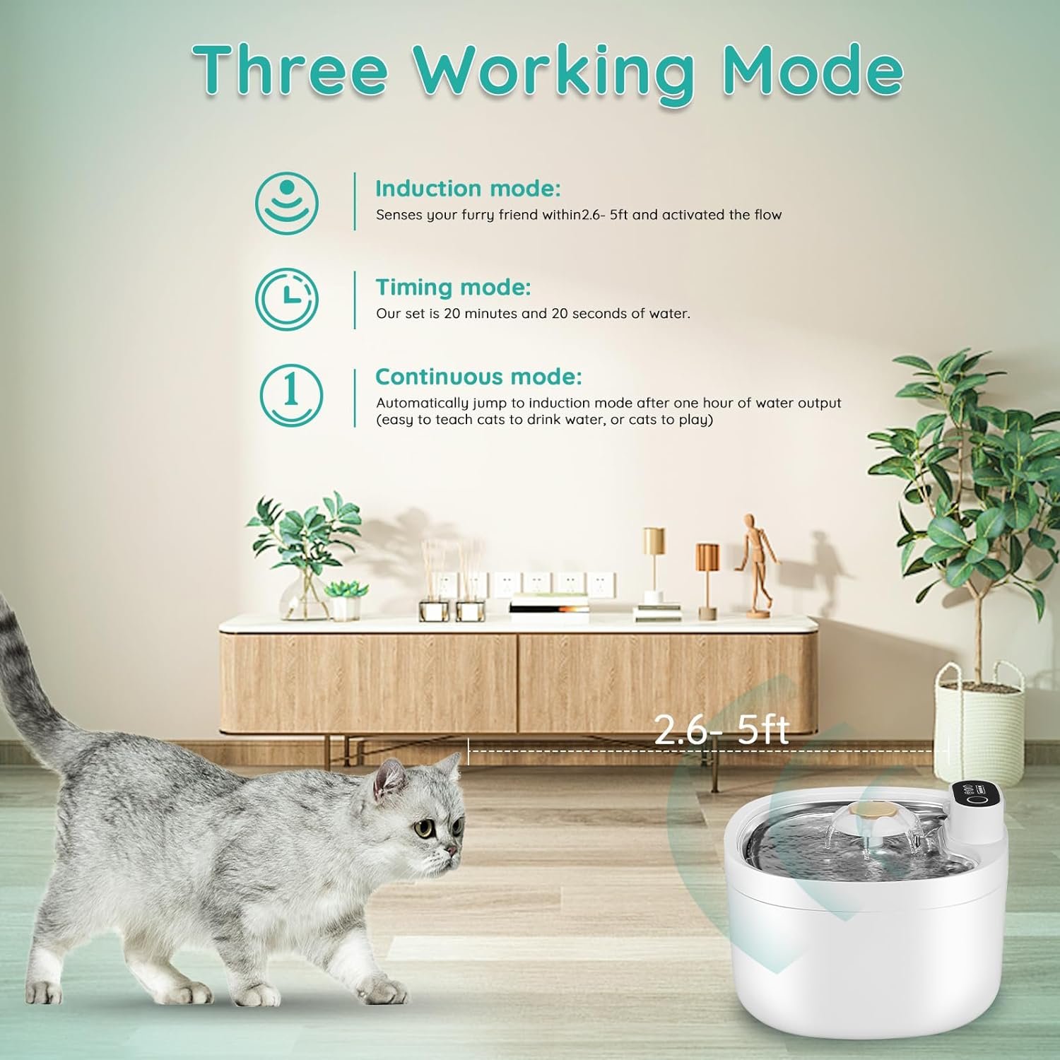 🐱🐶【Three Convenient Working Modes】This portable cat water fountain offers three modes. ①Induction Mode: It activates when it senses a pet within 2.6-5ft (120° sensing area). ②Timing Mode: It triggers a cyclic water supply every 20 minutes upon sensing movement. ③Continuous Mode: It runs non-stop until power depletes; plug it to a power source for an uninterrupted operation