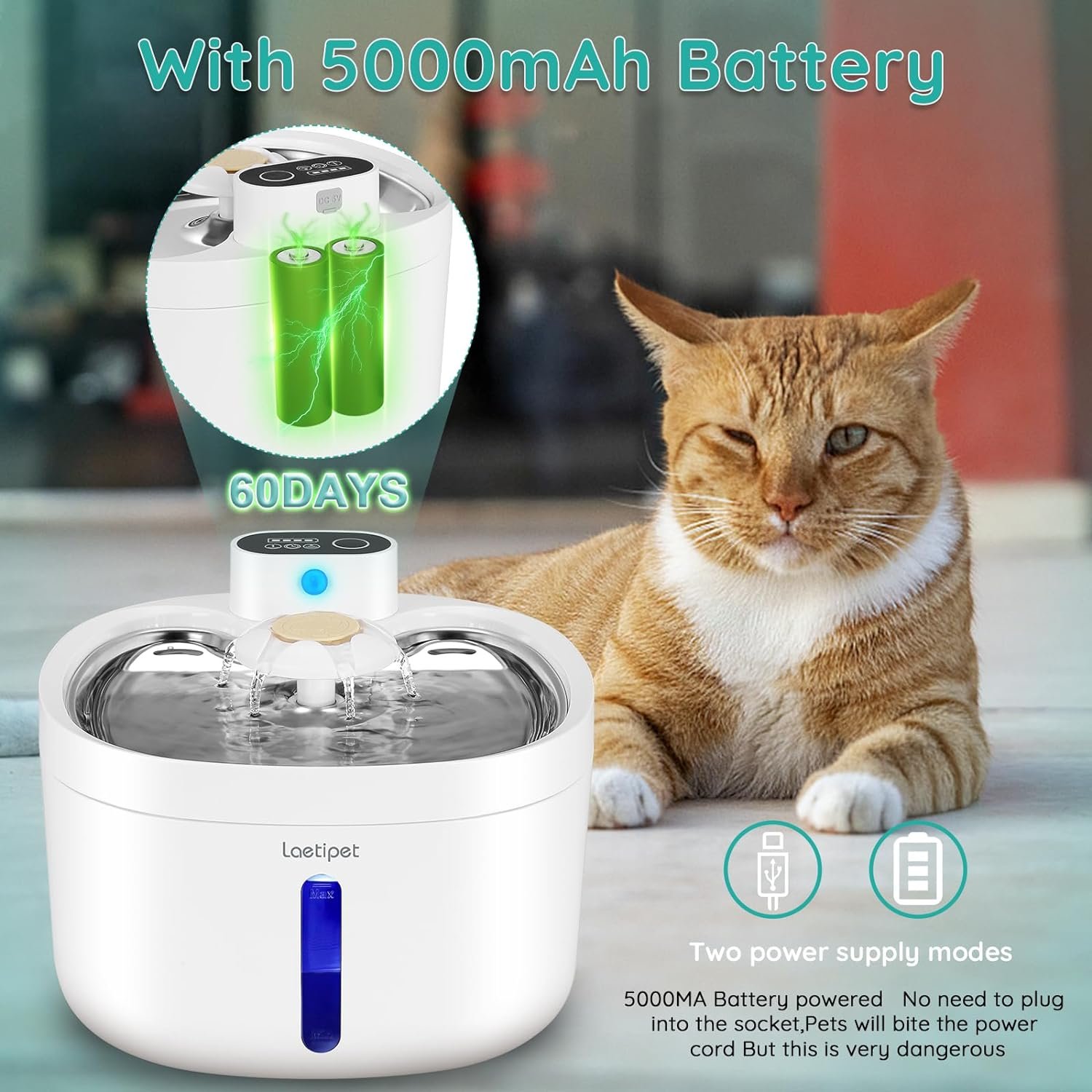 🐱🐶【Long-lasting 5000mAh Battery-powered Cat Water Fountain】This advanced cat water fountain features a powerful 5000mAh rechargeable battery that can last up to 35 days in induction mode and 60 days in timer mode. Ideal for homes where cats roam freely, the wireless feature allows you to set up the water fountain anywhere. Providing your cat with fresh water at any spot