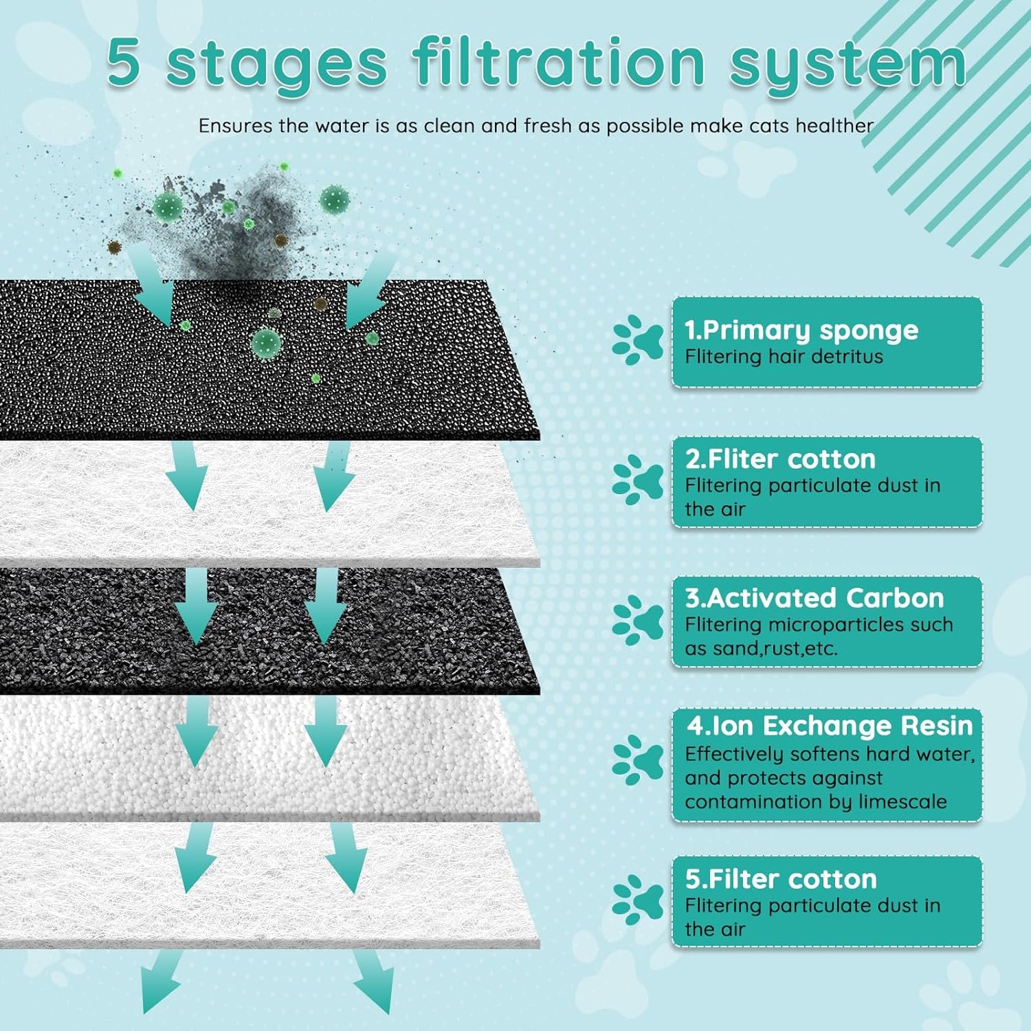 🐱🐶【Comprehensive Four-layer Filtration System】Our cat water fountain employs a four-stage filtration system to boost your pet’s drinking experience. It effectively gets rid of impurities, neutralizes odors, softens water, and enhances taste. The filter sponge collects pet hair, dirt, and food particles, ensuring your pet sips pure and healthy water. Please replace the carbon filter every 2-4 weeks for optimal results