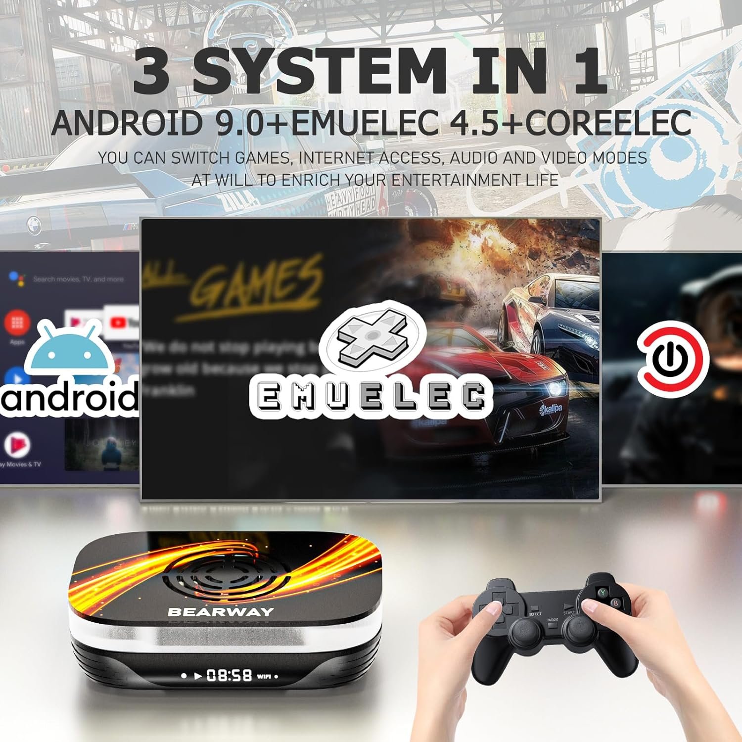 😀Three Systems All in One,Equipped with the latest EmuELEC4.5 game system + Android TV system + Core Emultimedia audio and video system, watching TV, playing games, and surfing the Internet can be easily switched, compact and easy to carry, plug and play, an excellent choice for family and friends gatherings or travel entertainment.