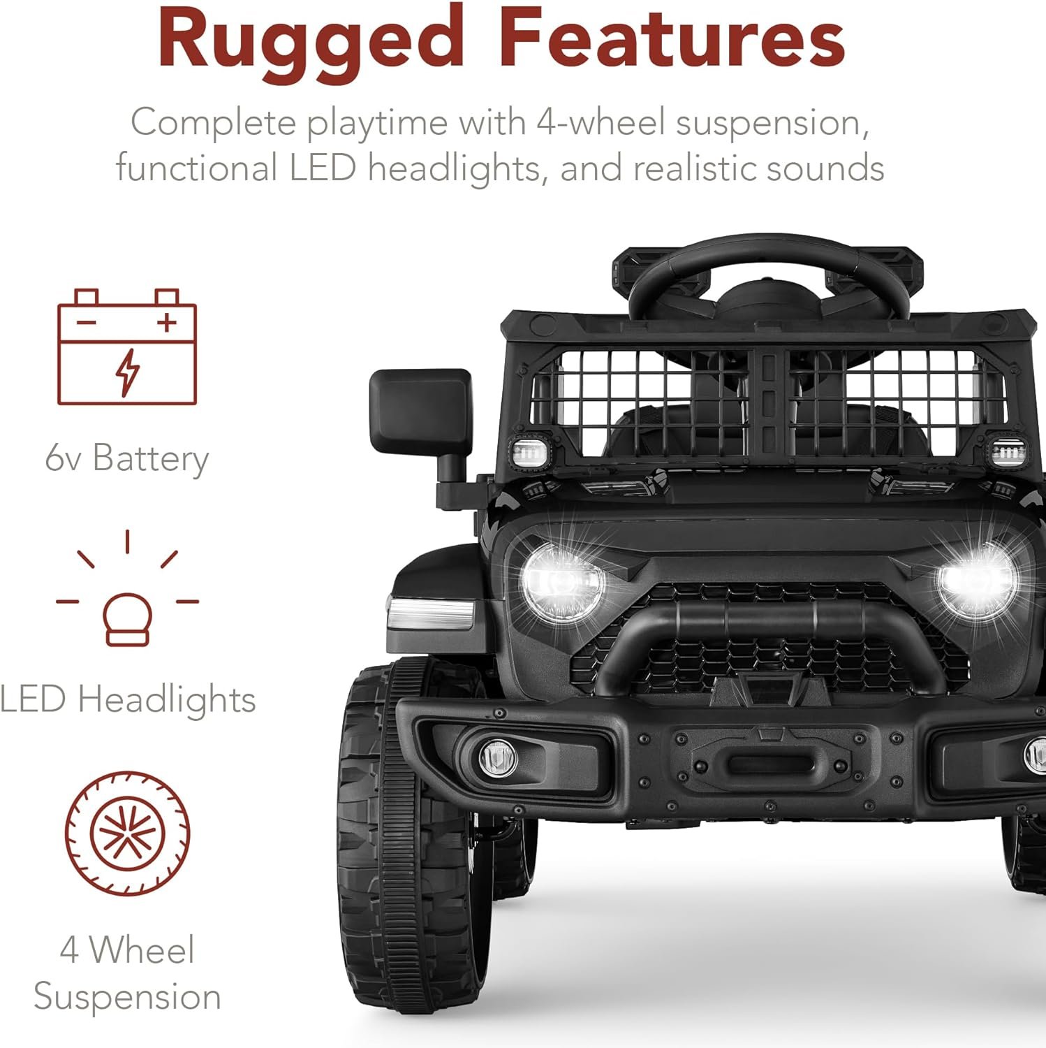 RUGGED FEATURES: Fully functioning plastic tires with 4-wheel suspension pair with functional LED headlights, realistic sounds, and a rechargeable battery; OVERALL DIMENSIONS: 34.5″(L) x 23.25″(W) x 22.75″(H); WEIGHT CAPACITY: 44 lbs.
