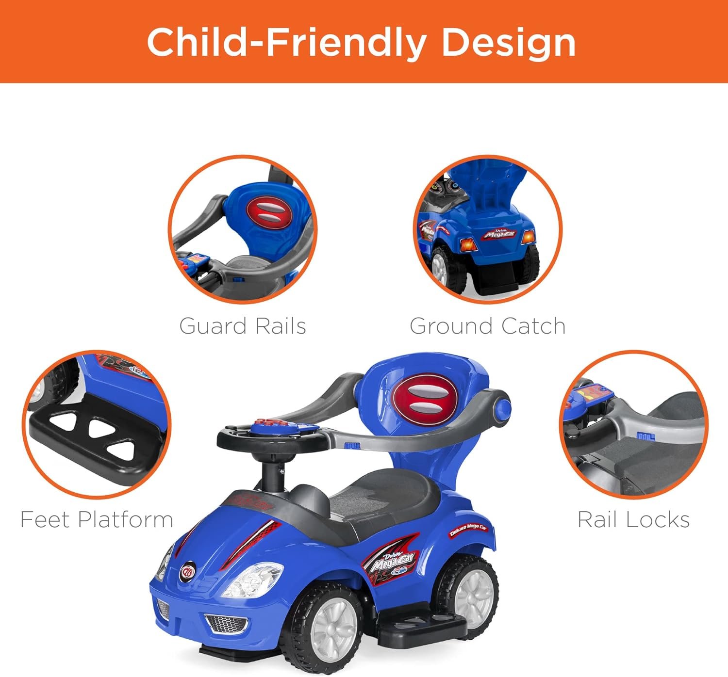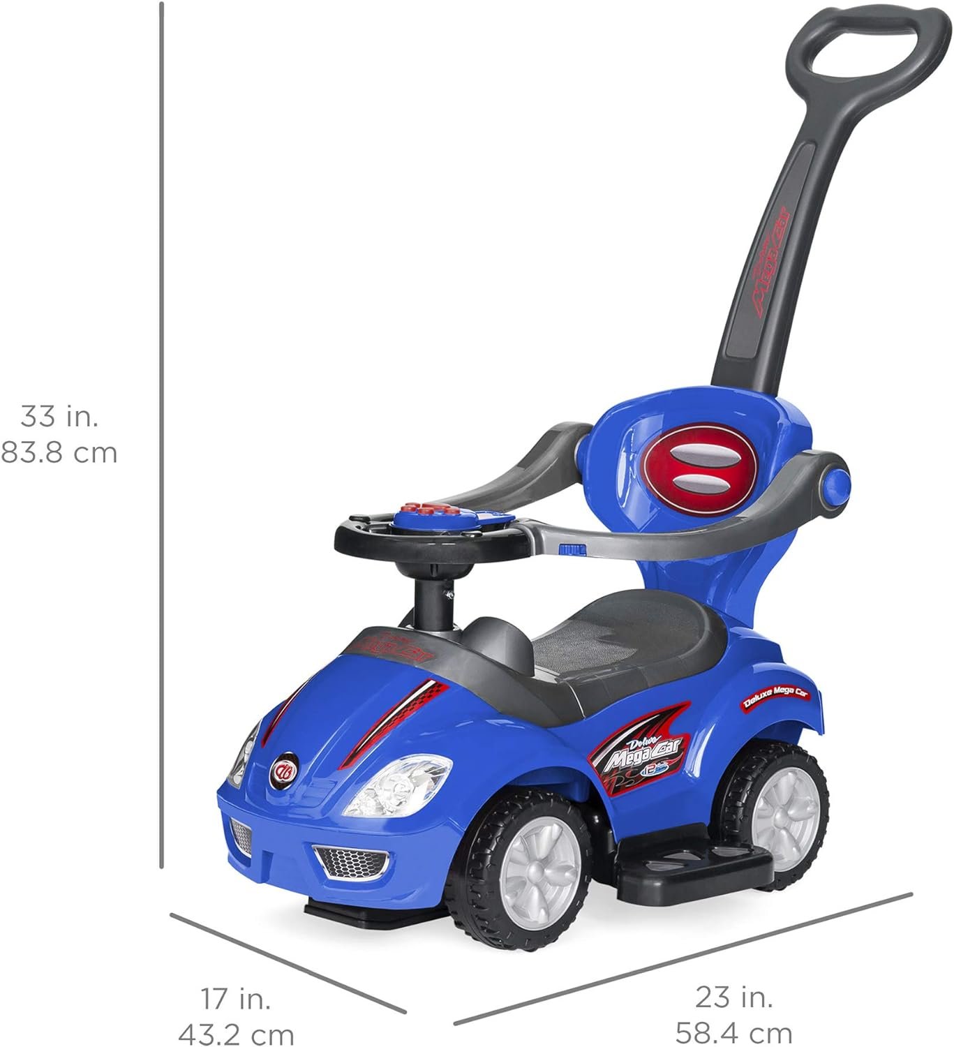 BACKREST: Your little one is supported in all 3 of the cars transformations, so they can lean back and have a learning curve if they lose their balance; OVERALL DIMENSIONS: 23″(L) x 17(W)” x 33″(H) (w/ handle); Weight Capacity: 50 lbs.