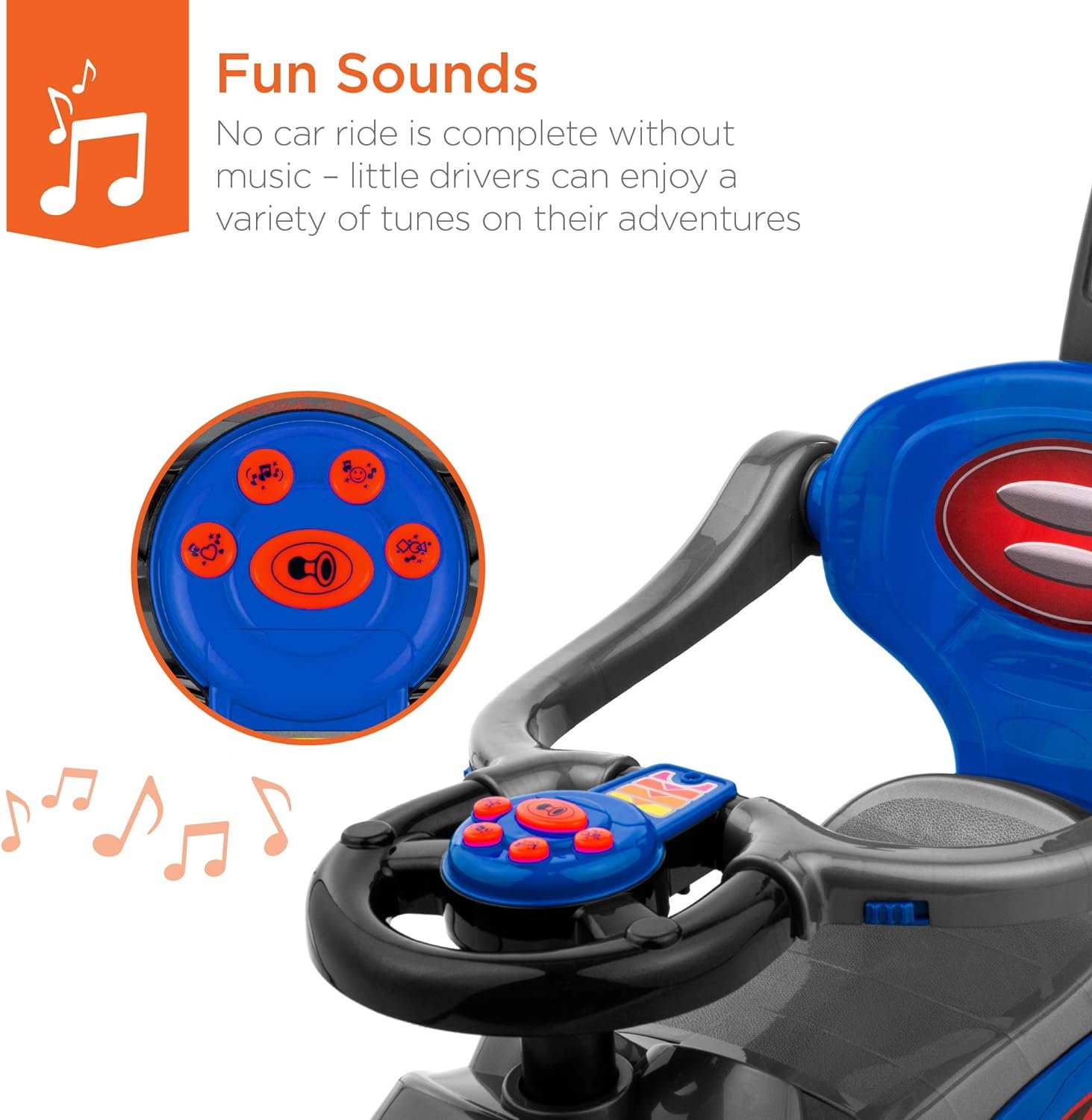 INTERACTIVE SOUNDS: The steering wheel is equipped with buttons so your child can beep the horn or select a variety of tunes during their car ride