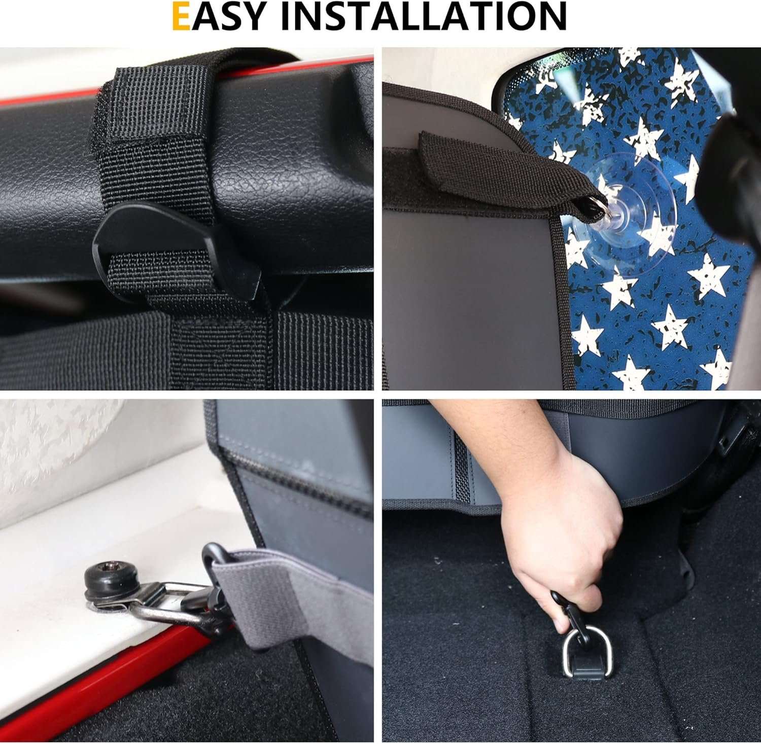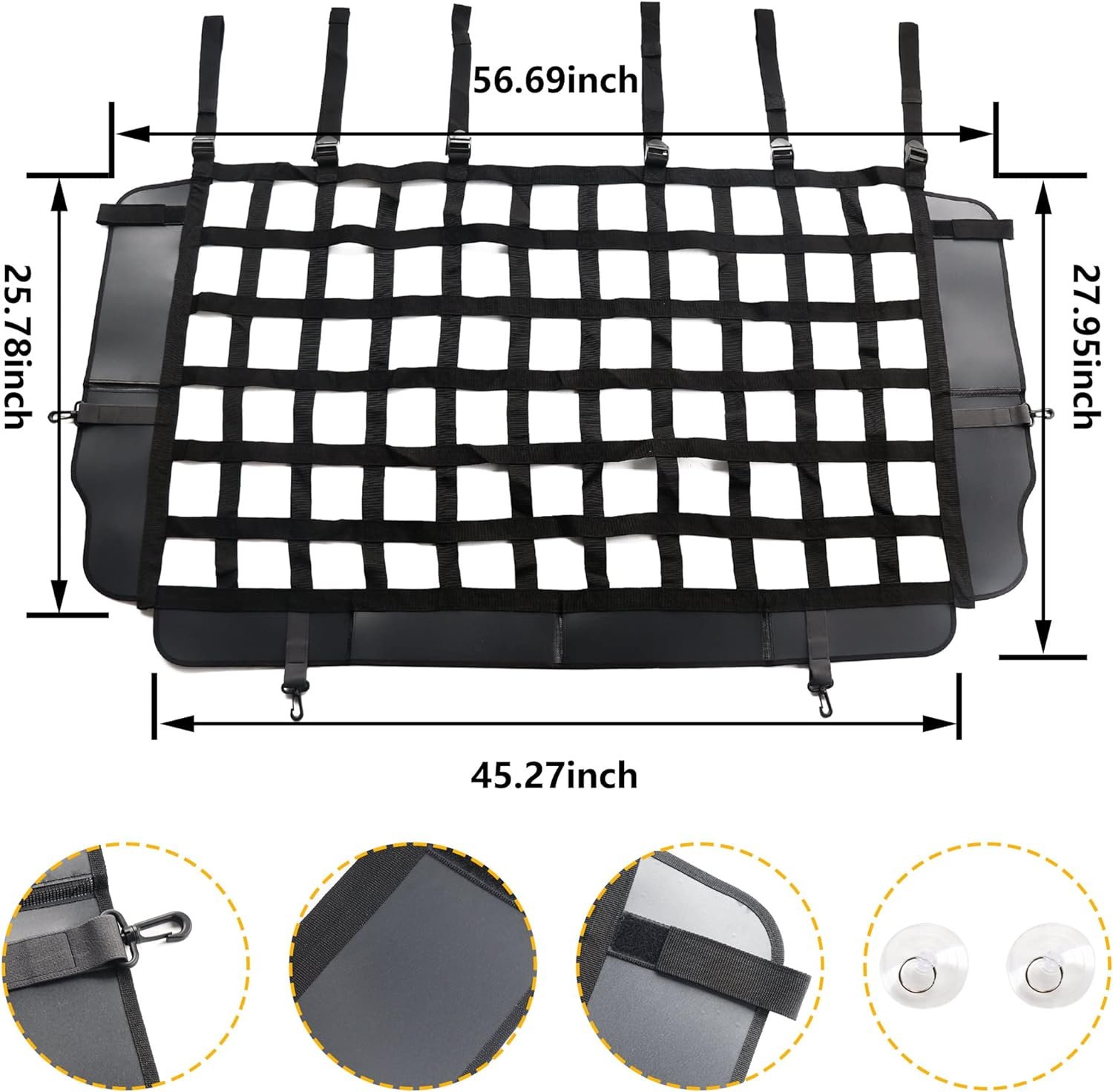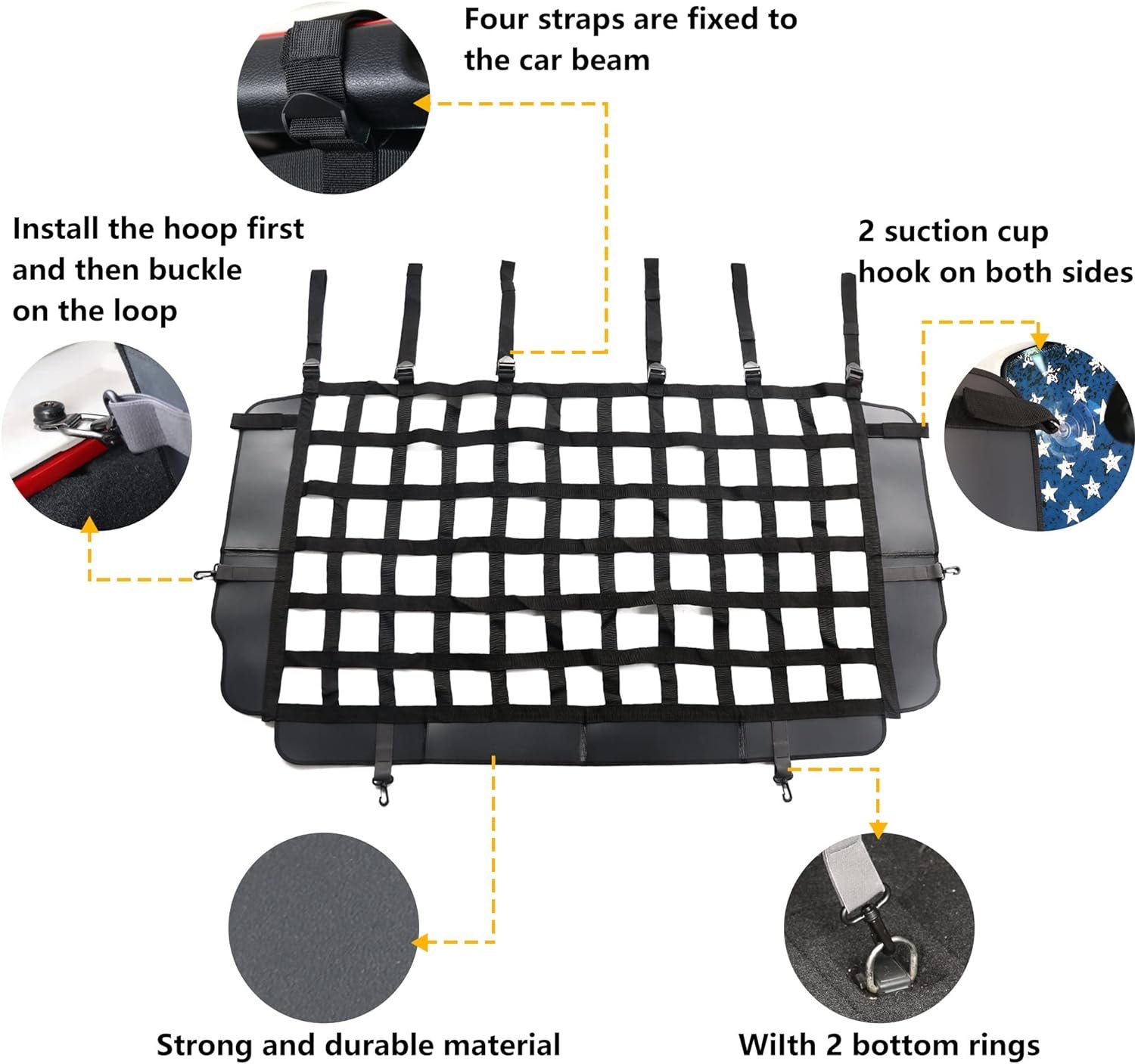 ✔【EASY INSTALLATION】- Cargo Net Dog Car Barrier does not require drilling or changes in your car. Come with 2 metal buckles, attached to the car side fit perfectly; 6 adjustable extension straps, strapped the top down; 2 metal side hook, 2 side suction cups and 2 metal bottom hook, can fix the position of the dog car net barrier; Making the dog car guard simple to hang on your car in 5 minutes.