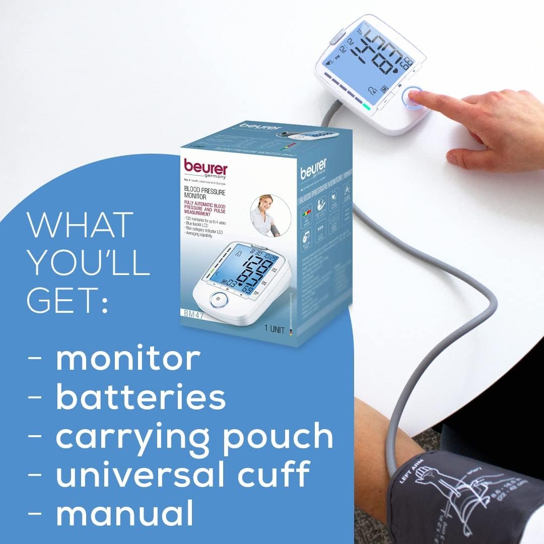 The Beurer BM47 Upper Arm Blood Pressure Monitor can help to ease your worries and stay on top of your health at home. Take responsibility for your heart health with our professional-grade, fully automatic blood pressure and pulse monitor, for the upper arm. We want to encourage you to make your health a priority, which is why our Blood Pressure Monitor Set includes a storage case, so that you can take your monitor anywhere – even on vacation.