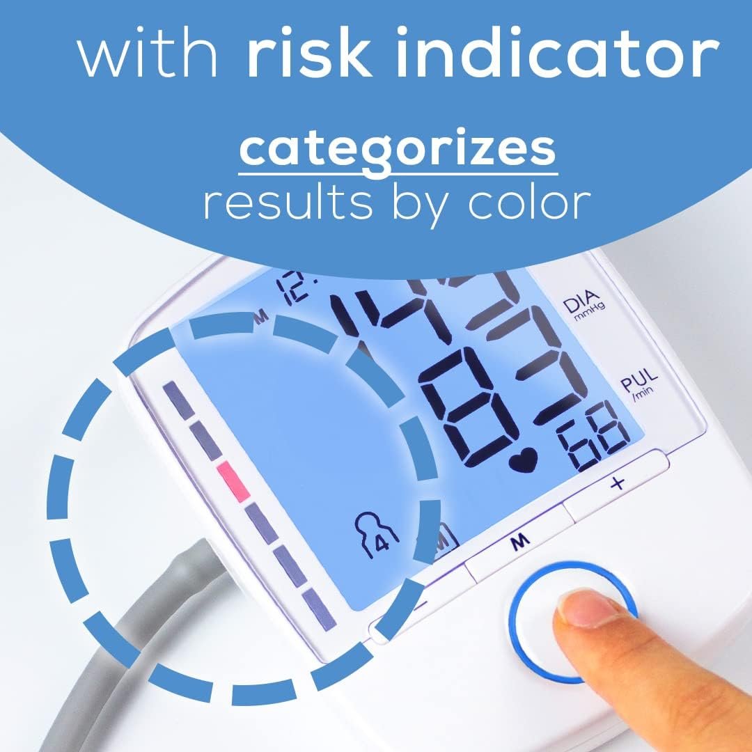 RISK INDICATOR: After a reading, the risk indicator on the side of the display will light up red, yellow, or green based on WHO blood pressure standards to help quickly interpret your blood pressure measurements