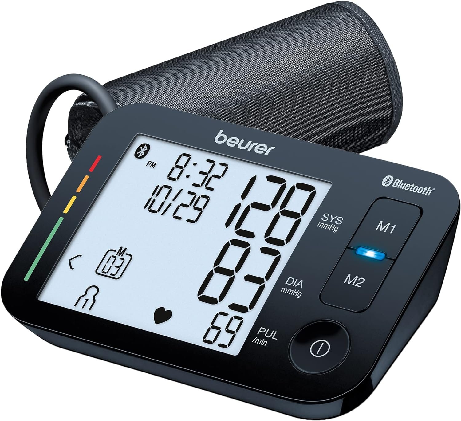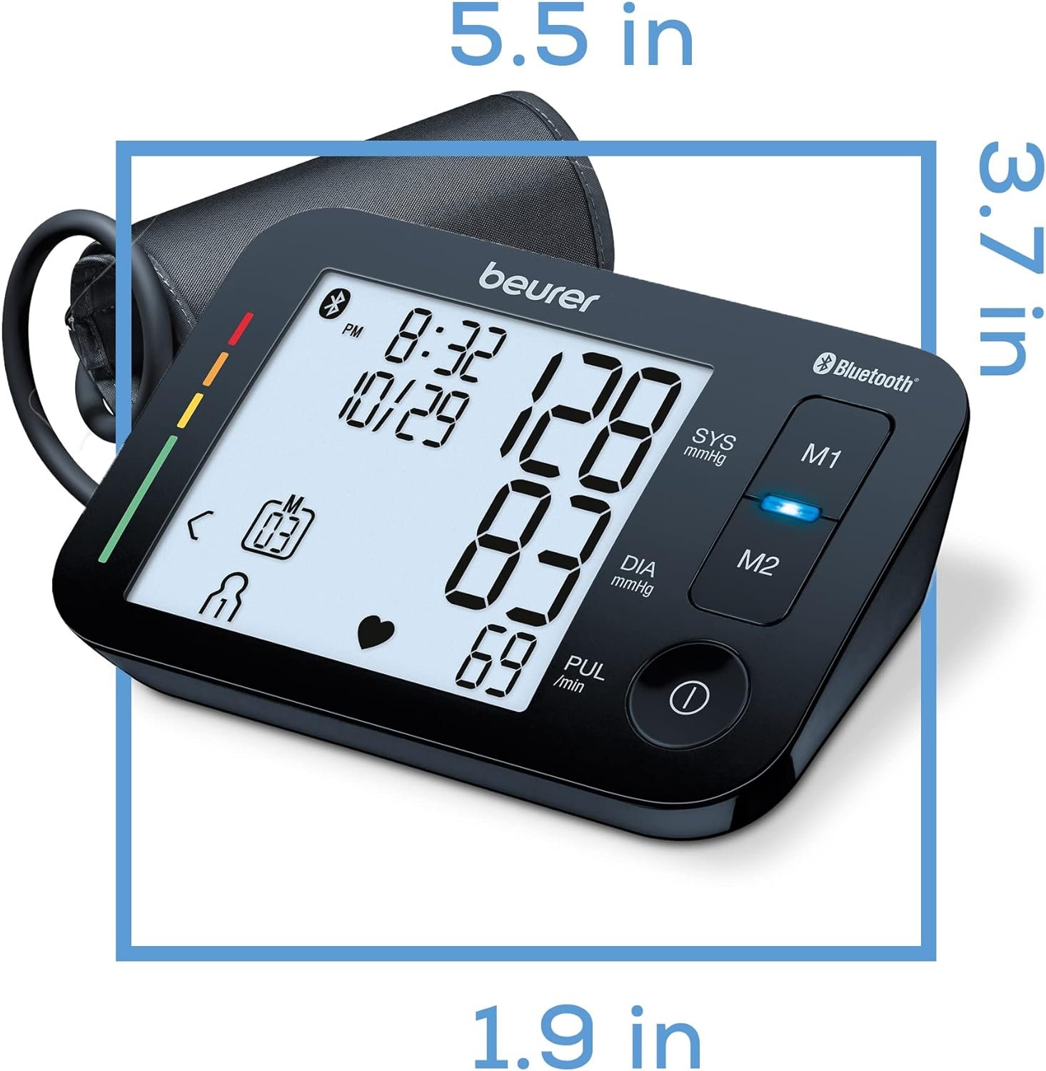 The Beurer BM54 Blood Pressure Machine is an upper arm monitor meant for tracking blood pressure and pulse. It includes the machine, automatic cuff, batteries, and storage case. Features bluetooth syncing through the app, arrhythmia detection, risk indicator, averaging function, XXL display, and 120 memory spaces for up to 2 users.