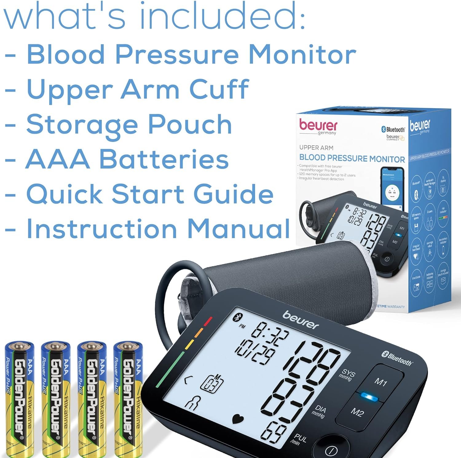 CLINICALLY PROVEN: Beurer’s blood pressure monitors are German-engineered for accuracy and clinically approved to measure your blood pressure, includes bpm machine, cuff, batteries, and case