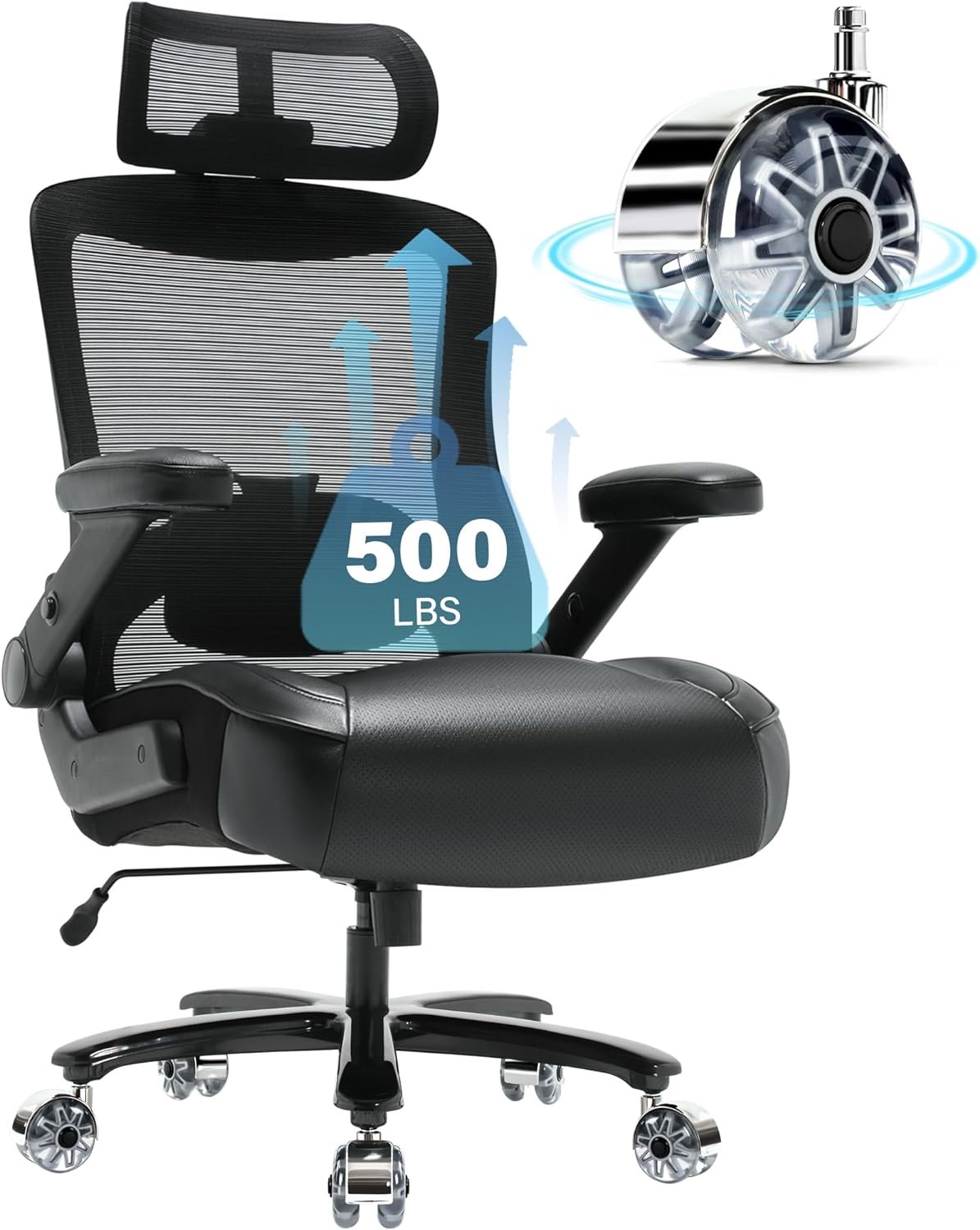 The COOLKA large office chair is your go-to for durability, comfort, and style. With heavy duty metal base, rubber wheels, thick padded seat cushion and 3D flip up armrests, the executive office chair for heavy people can support up to 500lbs and resist the test of time.