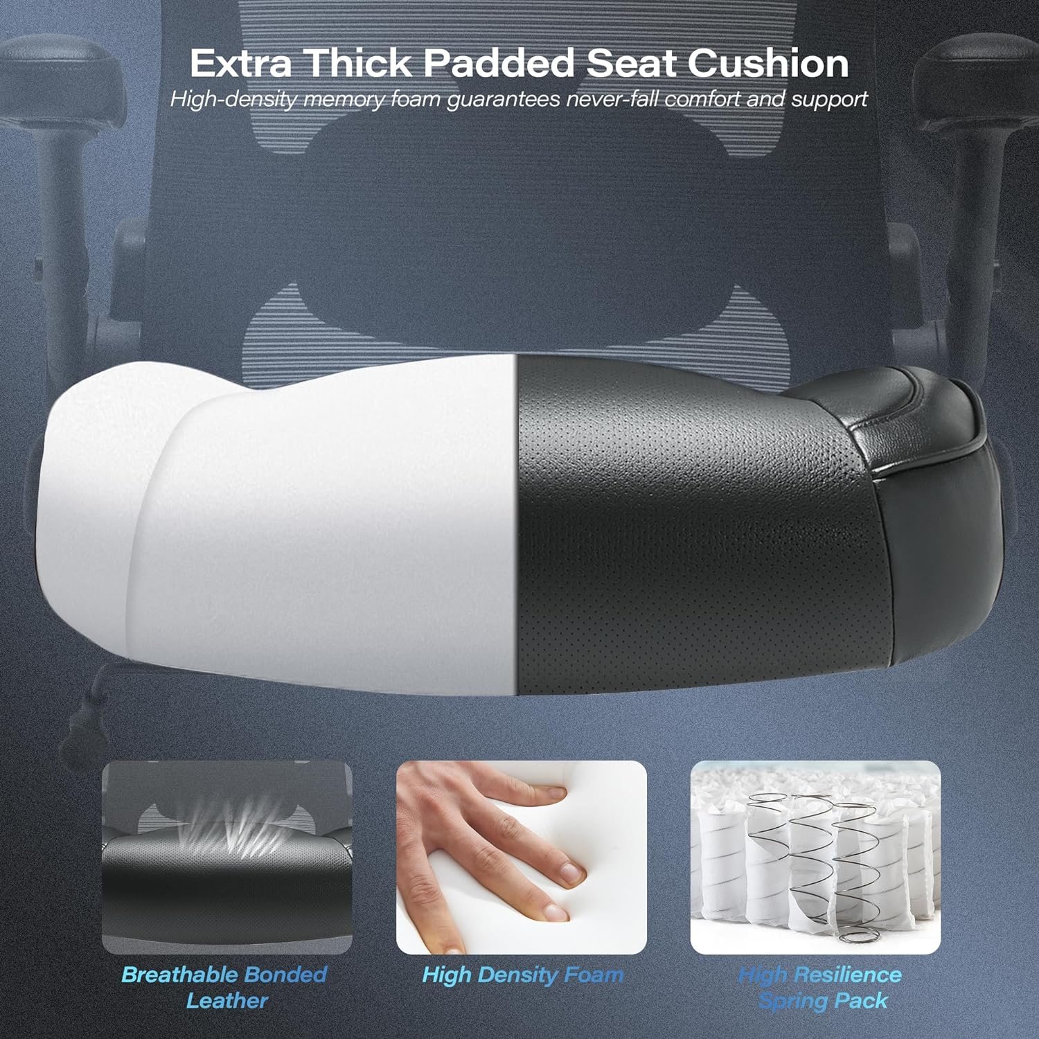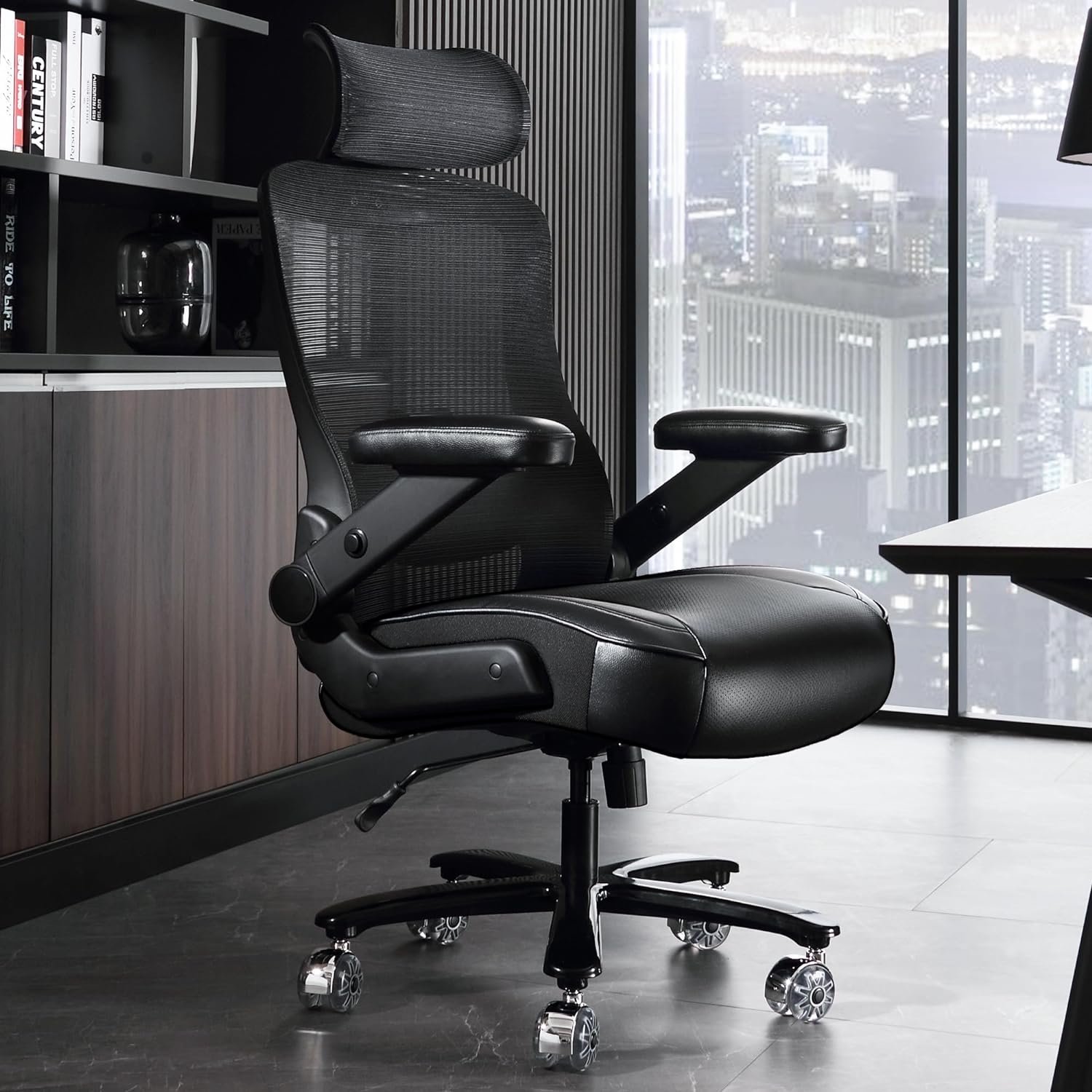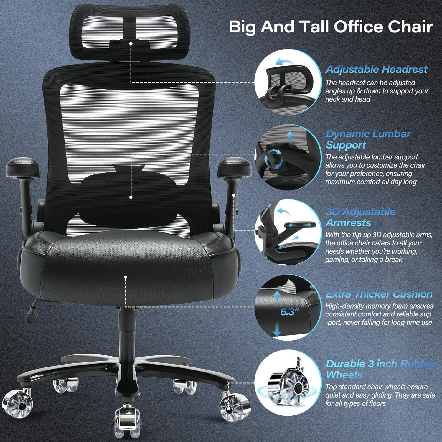 🏁INNOVATIVE COMBINATION OF MESH BACKREST AND LEATHER SEAT CUSHION: This mesh office chair big and tall combine ventilated mesh backrest with thick padded leather seat cushion. The mesh back maintain the air flowing naturally in the back area while keeping your back cool and sweat-free. At the same time, the leather thick padded seat cushion features a waterfall-edge design, providing fully support for your hip and thigh.