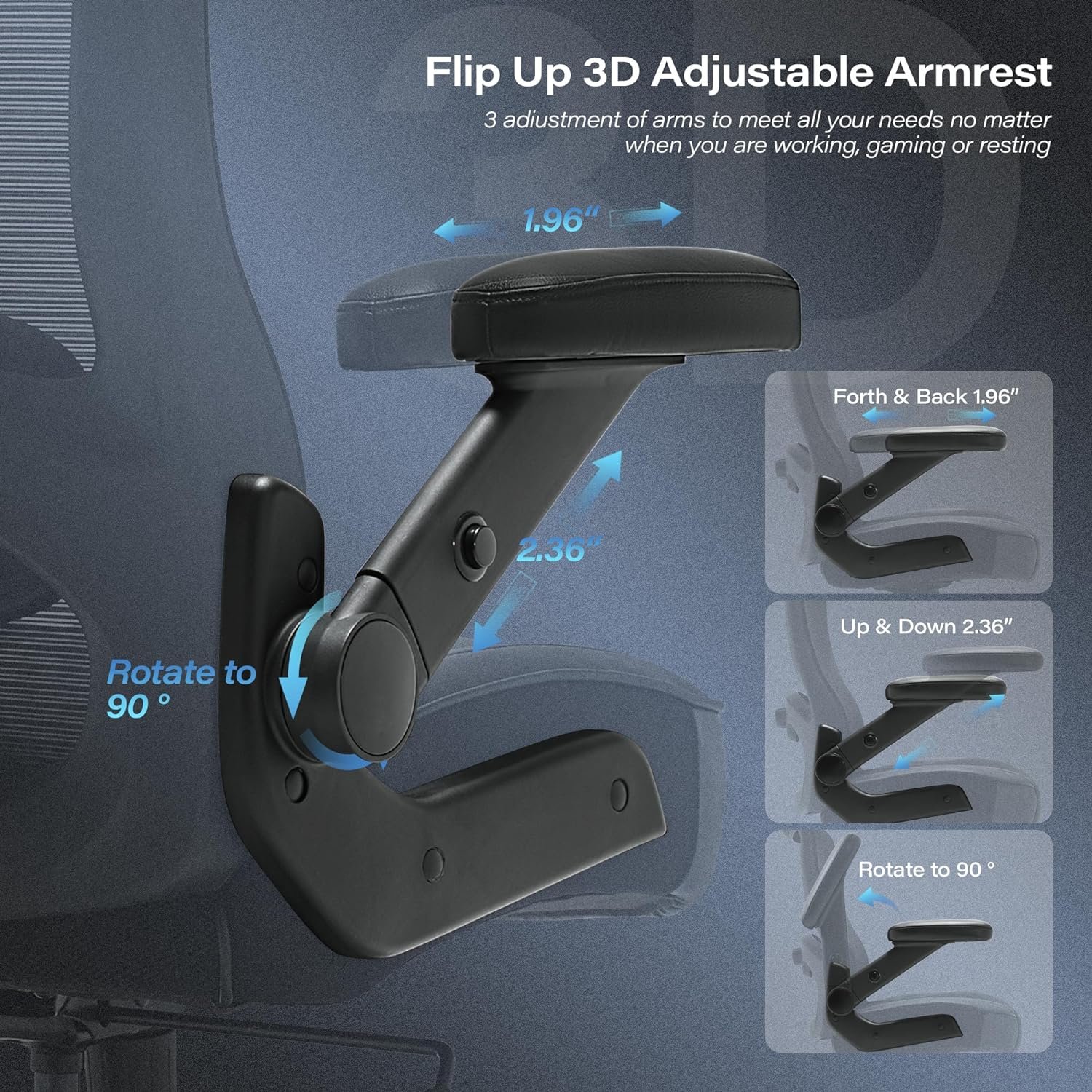 Experience customization comfort with the 3D adjustable armrests, allowing you to find the perfect position for your arms and shoulders. The adjustable lumbar support for your lower back will relieve any discomfort or strain caused by prolonged sitting. The headrest can be moved according to your needs, providing full support to your head.