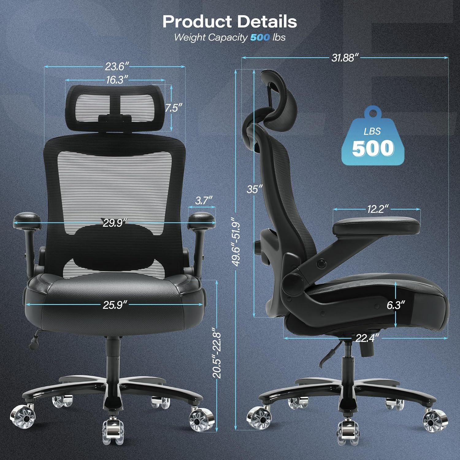 🏁EHANCED COMFORT WITH ADJUSTABLE HIGH BACK OFFICE CHAIR : Are you tired of high chairs that make you hunch and cause you discomfort after long work time? Our big and tall office chair 500lbs features adjustable lumbar support, which provides optimal back support and helps alleviate lower back pain. And the L-shaped backrest fits the natural curve of your spine to provide effective support for your hips, back and shoulders. Besides, the adjustable headrest allows you to customize your sitting posture, making you be more productive and comfortable for extended work hours.