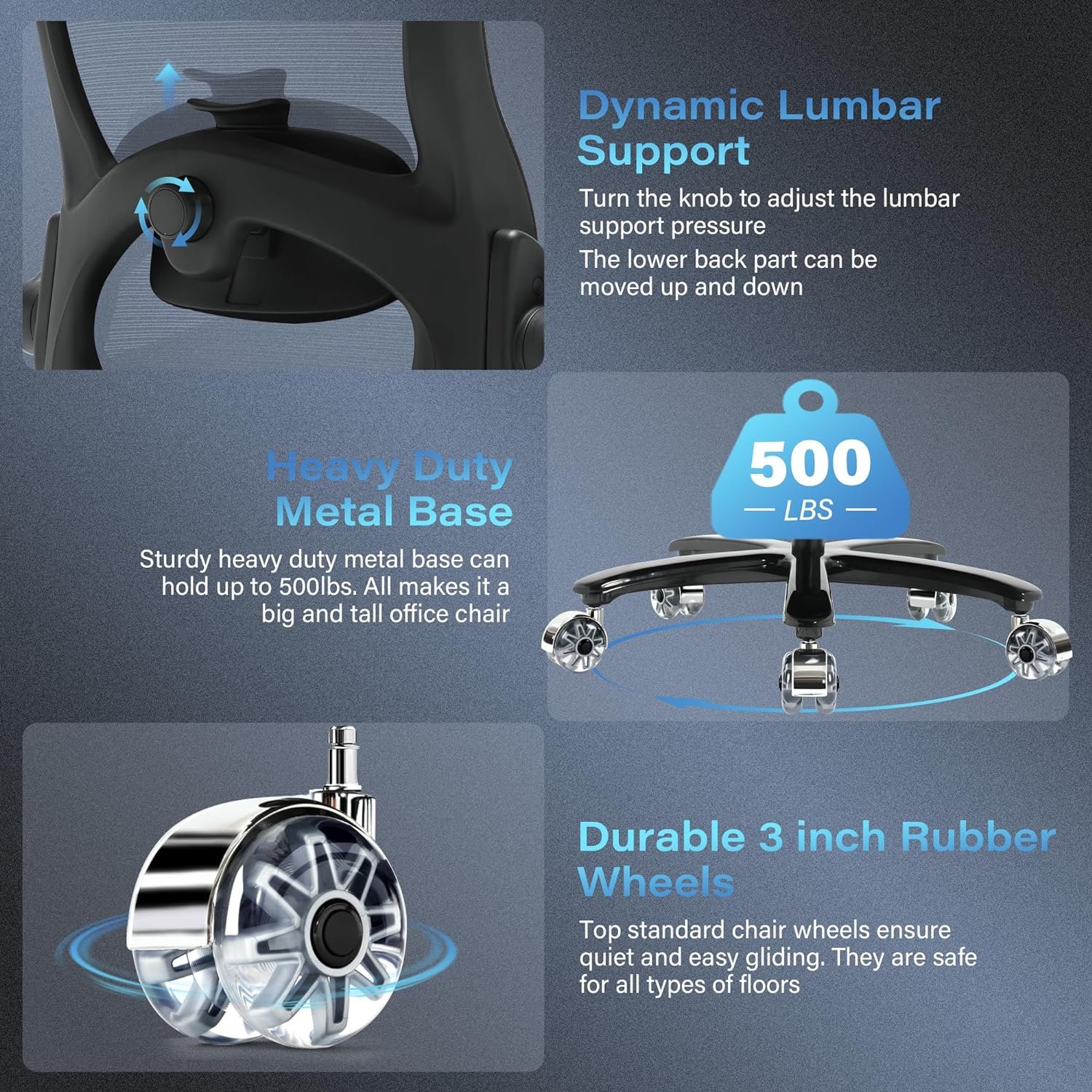 The 500lbs mesh office chair is designed to provide optimal comfort and support for big and tall individuals. This comfy office chair is extra stable with a strong metal base. Upgraded large durable rubber chair casters roll smoothly and quietly, which will not leave any mark on your floor.