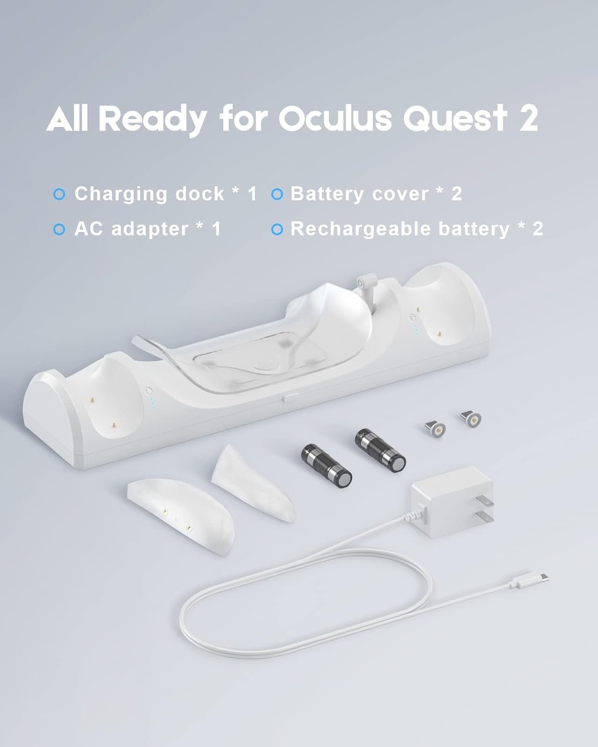 【What you will get】Package include: 1 x Charging Dock for Quest 2, 1 x 5V/3A power adapter with Cable, 2 x Type-C Connector, 2 x Rechargeable Controller Batteries, 2 x Charging Covers, 1 x User Manual.