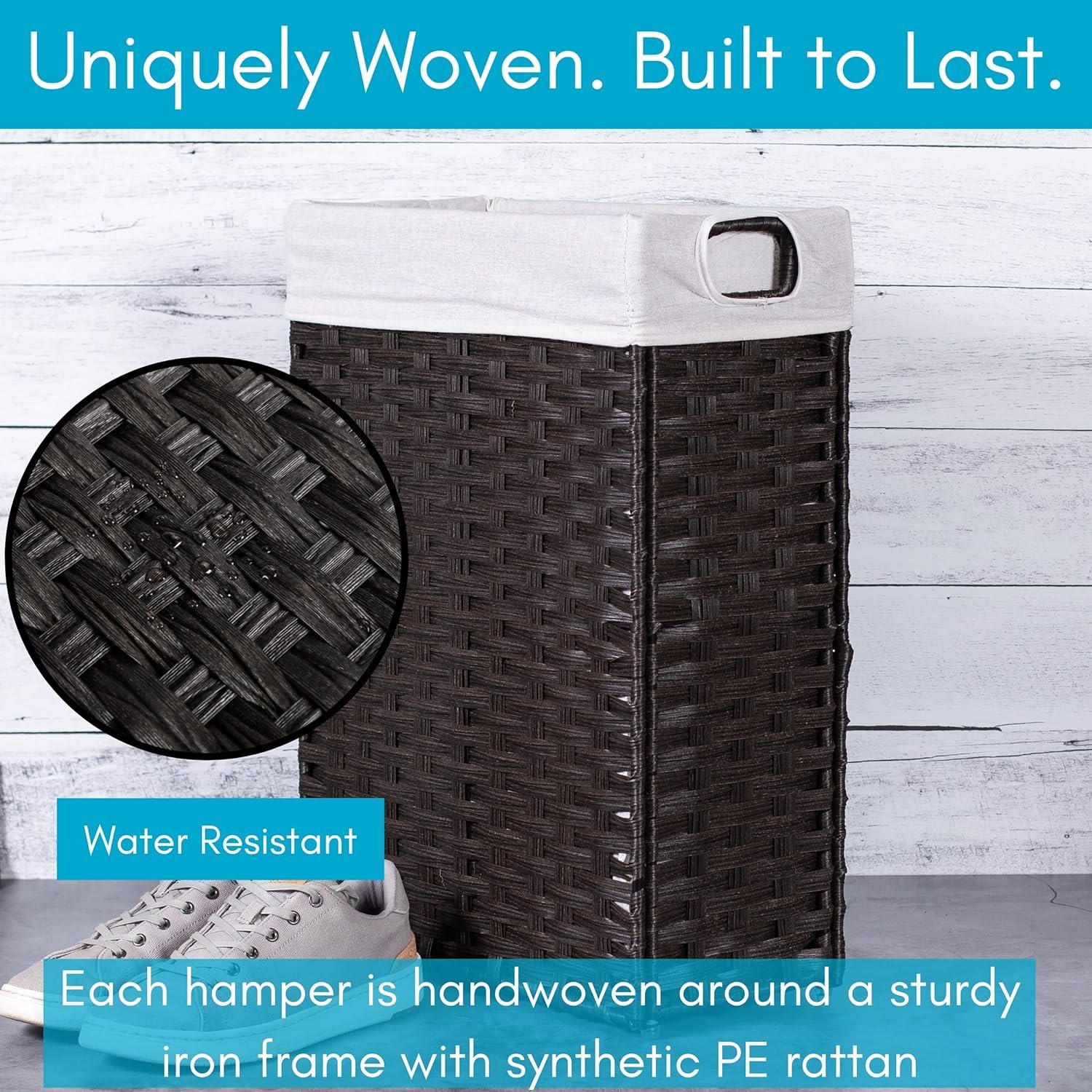 Robust and Waterproof: Constructed from durable, waterproof synthetic PE rattan, it’s ideal for use in moisture-prone areas. The iron frame provides strength, allowing the hamper to hold up to 45 lbs, yet it remains light for easy movement.